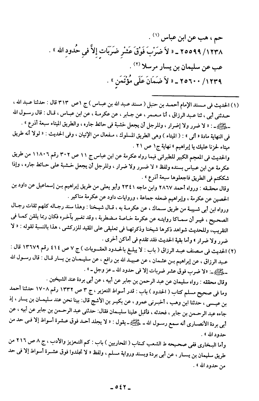 (¬2) الحديث في مصنف عبد الرزاق (باب: لا يبلغ بالحدود العقوبات) ج 7 ص 414 رقم 13679 قال: عبد الرزاق، عن إبراهيم بن عثمان، عن عبيد الله بن رافع، عن سليمان بن يسار قال: قال رسول الله - صلى الله عليه وسلم -: "لا ضرب فوق عشر ضربات إلا في حدود الله - عز وجل - ".