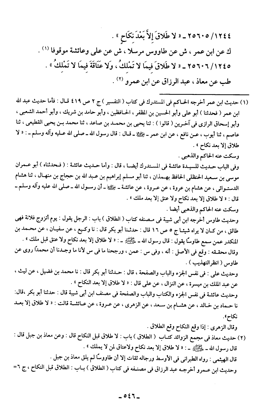 (¬1) حديث ابن عمر أخرجه الحاكم في المستدرك في كتاب (التفسير) ج 2 ص 419 قال: فأما حديث عبد الله ابن عمر (فحدثنا) أبو علي وأبو الحسين بن المظفر، الحافظين، وأبو حامد بن شريك، وأبو أحمد الشعبي، وأبو إسحاق الرازي في آخرين (قالوا): ثنا يحيى بن محمد بن صاعد، ثنا محمد بن يحيى القطيعي، ثنا عاصم، ثنا أيوب، عن نافع، عن ابن عمر - رضي الله عنهما - قال: قال رسول الله - صلى الله عليه وآله وسلم -: "لا طلاق إلا بعد نكاح".