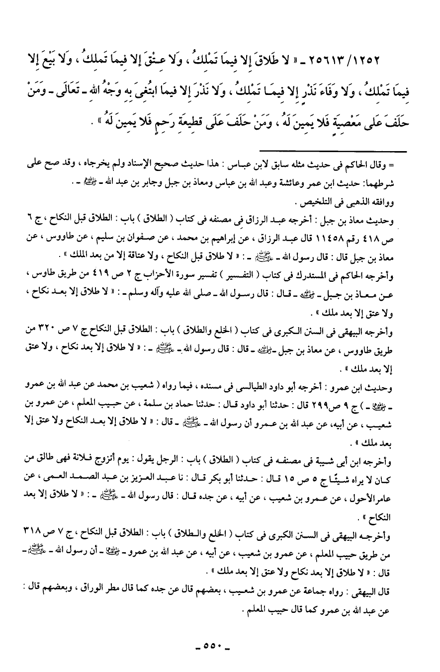 1252/ 25613 - "لا طَلاقَ إِلا فِيمَا تَمْلِكُ، وَلا عِتْقَ إلا فيمَا تَملِكُ، وَلا بَيع إِلا فِيمَا تَمْلِكُ، وَلا وَفَاءَ نَذْرٍ إِلا فِيمَا تَمْلِكُ، وَلا نَذْرَ إِلا فيمَا ابتُغِي بِهِ وَجْهُ اللهِ -تَعَالى- وَمَنْ حَلَفَ عَلى مَعْصِيَةٍ فَلا يَمِينَ لَهُ، وَمَنْ حَلَفَ عَلَى قطِيعَةِ رَحِمٍ فلا يَمِينَ لَهُ".