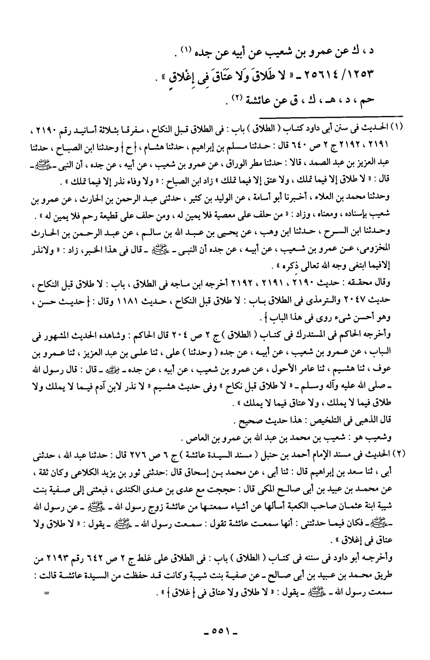 (¬2) الحديث في مسند الإمام أحمد بن حنبل (مسند السيدة عائشة) ج 6 ص 276 قال: حدثنا عبد الله، حدثني أبي، ثنا سعد بن إبراهيم قال: ثنا أبي، عن محمد بن إسحاق قال: حدثني ثور بن يزيد الكلاعى وكان ثقة، عن محمد بن عبيد بن أبي صالح المكي قال: حججت مع عدى بن عدي الكندى، فبعثنى إلى صفية بنت شيبة ابنة عثمان صاحب الكعبة أسألها عن أشياء سمعتها من عائشة زوج رسول الله - صلى الله عليه وسلم - عن رسول الله - صلى الله عليه وسلم - فكان فيما حدثتني: أنها سمعت عائشة تقول: سمعت رسول الله - صلى الله عليه وسلم - يقول: "لا طلاق ولا عتاق في إغلاق".