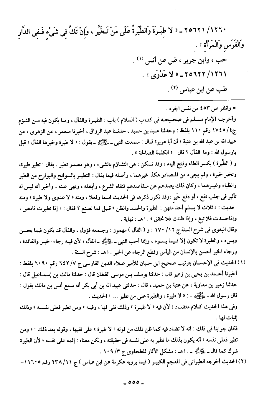 1260/ 25621 - "لا طيَرَةَ وَالطِّيَرَةُ عَلَى مَنْ تَطَيَّر، وَإنْ تَك في شَيء فَفي الدَّار وَالفَرَسِ وَالمَرْأةِ".
