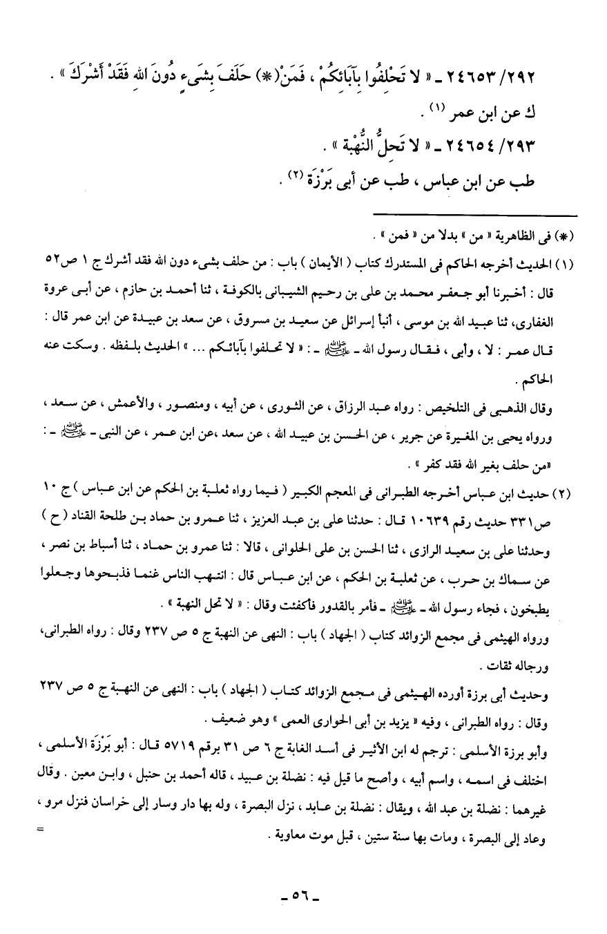 292/ 24653 - "لا تَحْلِفُوا بِآبَائِكُمْ، فَمَنْ (*) حَلَفَ بِشَئٍ دُونَ اللهِ فَقَدْ أَشْرَكَ".