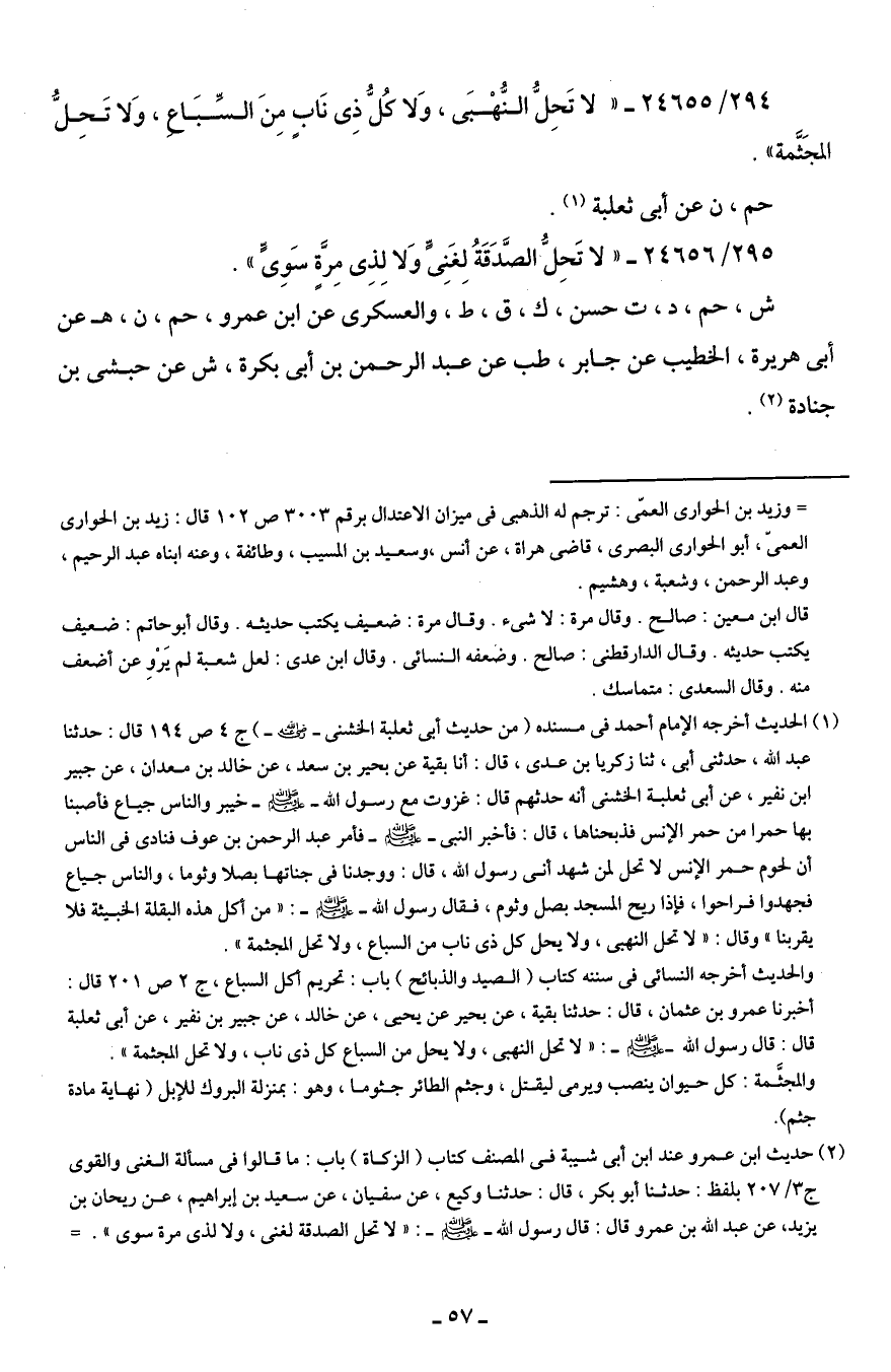 294/ 24655 - "لا تَحِلُّ النُّهْبَى، وَلا كُلُّ ذي نَاب منَ السّبَاع، وَلا تَحلُّ المجَثَّمة".