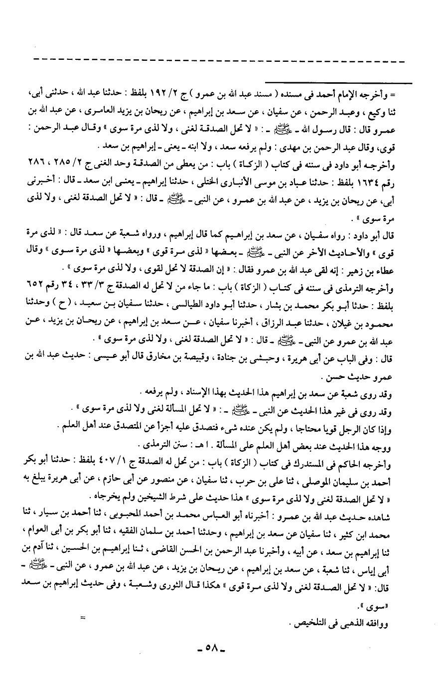 شاهده حديث عبد الله بن عمرو: أخبرناه أبو العباس محمد بن أحمد المحبوبى، ثنا أحمد بن سيار، ثنا محمد بن كثير، ثنا سفيان عن سعد بن إبراهيم، وحدثنا أحمد بن سلمان الفقيه، ثنا أبو بكر بن أبي العوام، ثنا إبراهيم بن سعد، عن أبيه، وأخبرنا عبد الرحمن بن الحسن القاضي، ثنا إبراهيم بن الحسين، ثنا آدم بن أبي إياس، ثنا شعبة، عن سعد بن إبراهيم، عن ريحان بن يزيد، عن عبد الله بن عمرو، عن النبي - صلى الله عليه وسلم - قال: "لا تحل الصدقة لغنى ولا لذى مرة قوى" هكذا قال الثوري وشعبة، وفي حديث إبراهيم بن سعد "سوى".