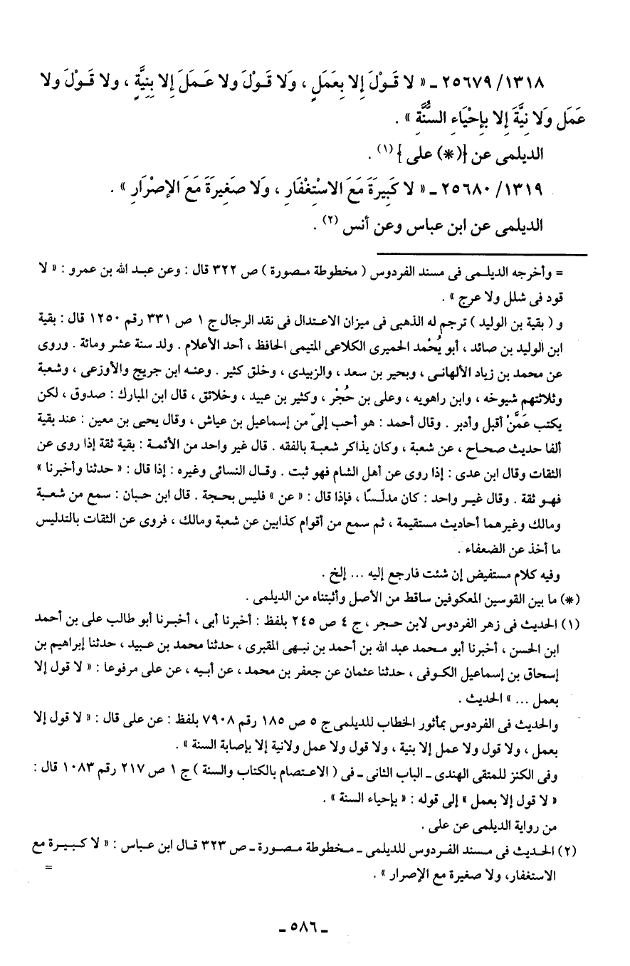 1318/ 25679 - "لا قَوْلَ إِلا بِعَمَلٍ، وَلا قَوْلَ ولا عَمَلَ إِلا بِنِيَّةٍ، ولا قَوْلَ ولا عَمَل وَلا نِيَّةَ إِلا بإِحْيَاءِ السُّنَّةِ".