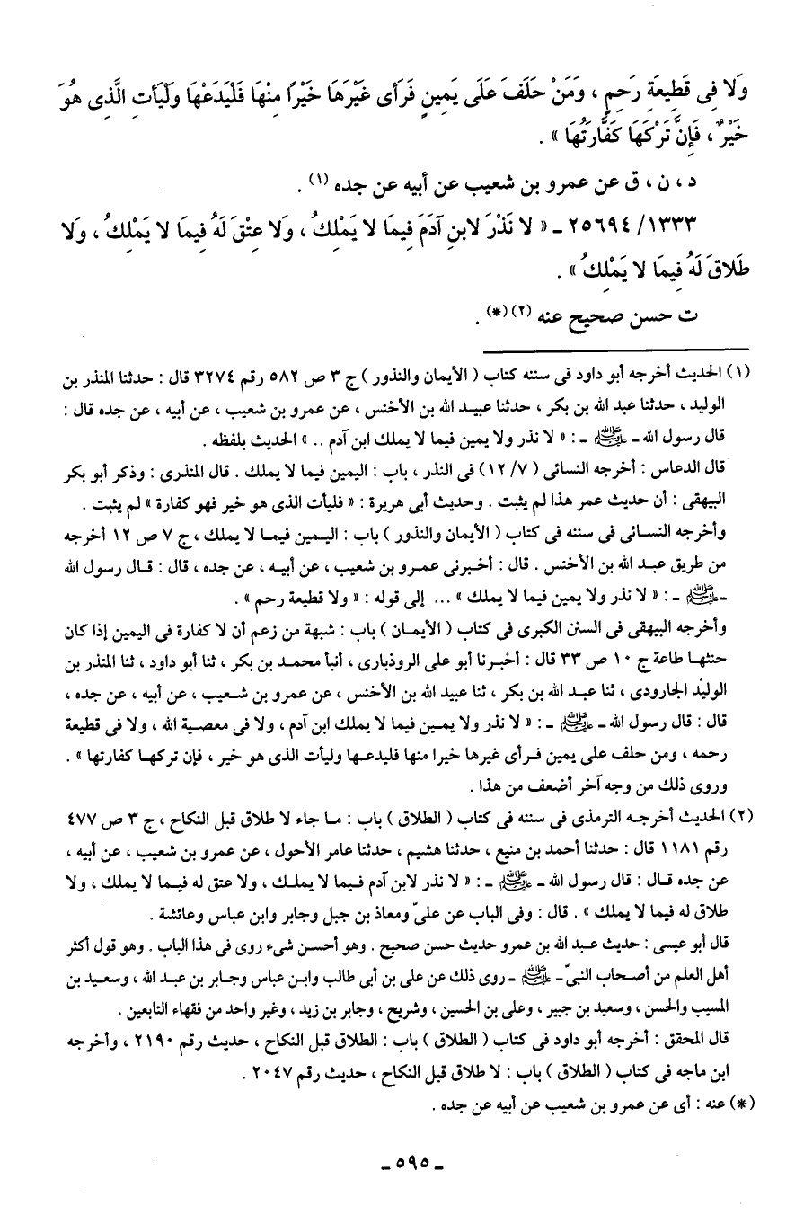 (¬1) الحديث أخرجه أبو داود في سننه كتاب (الأيمان والنذور) ج 3 ص 582 رقم 3274 قال: حدثنا المنذر بن الوليد، حدثنا عبد الله بن بكر، حدثنا عبيد الله بن الأخنس، عن عمرو بن شعيب، عن أبيه، عن جده قال: قال رسول الله - صلى الله عليه وسلم -: "لا نذر ولا يمين فيما لا يملك ابن آدم .. " الحديث بلفظه.