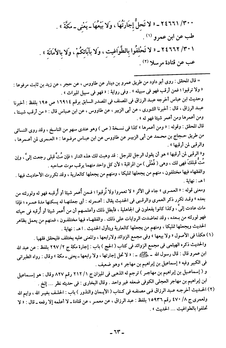 وحديث ابن عباس أخرجه عبد الرزاق في المصنف في المصدر السابق برقم 16914 ص 195 بلفظ: أخبرنا عبد الرزاق، قال: أخبرنا الثوري، عن أبي الزبير، عن طاووس، عن ابن عباس قال: "من أرقب شيئًا، ومن أعمرها ومن أعمر شيئًا فهو له".