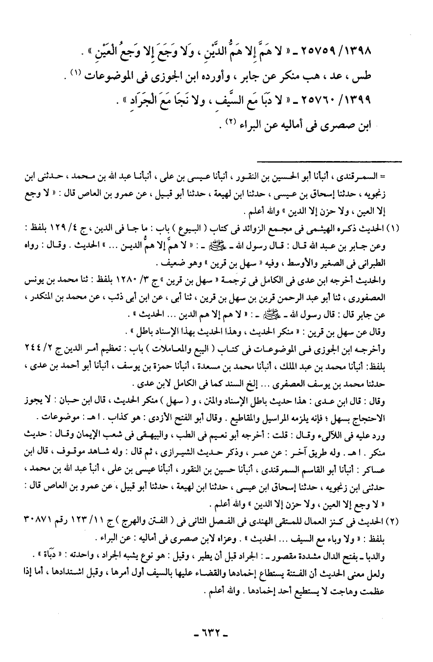 (¬1) الحديث ذكره الهيثمي في مجمع الزوائد في كتاب (البيوع) باب: ما جا في الدين، ج 4/ 129 بلفظ: وعن جابر بن عبد الله قال: قال رسول الله - صلى الله عليه وسلم -: "لا همَّ إلا همُّ الدين ... " الحديث. وقال: رواه الطبراني في الصغير والأوسط، وفيه "سهل بن قرين" وهو ضعيف.