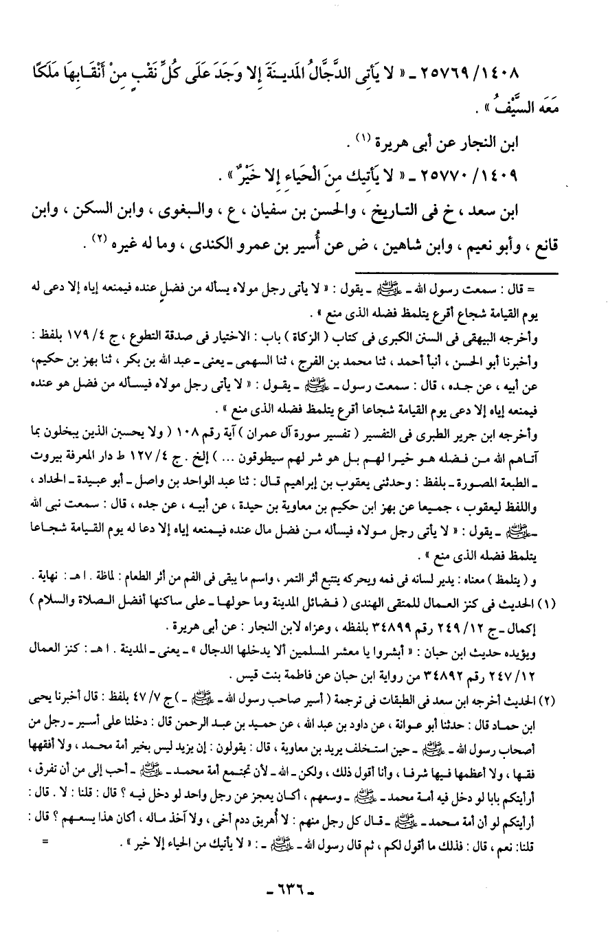 1408/ 25769 - "لا يَأتِي الدَّجَّالُ المَدينَةَ إِلا وَجَدَ عَلَى كُلِّ نَقْبٍ مِنْ أنْقَابِهَا مَلَكًا مَعَه السَّيفُ".