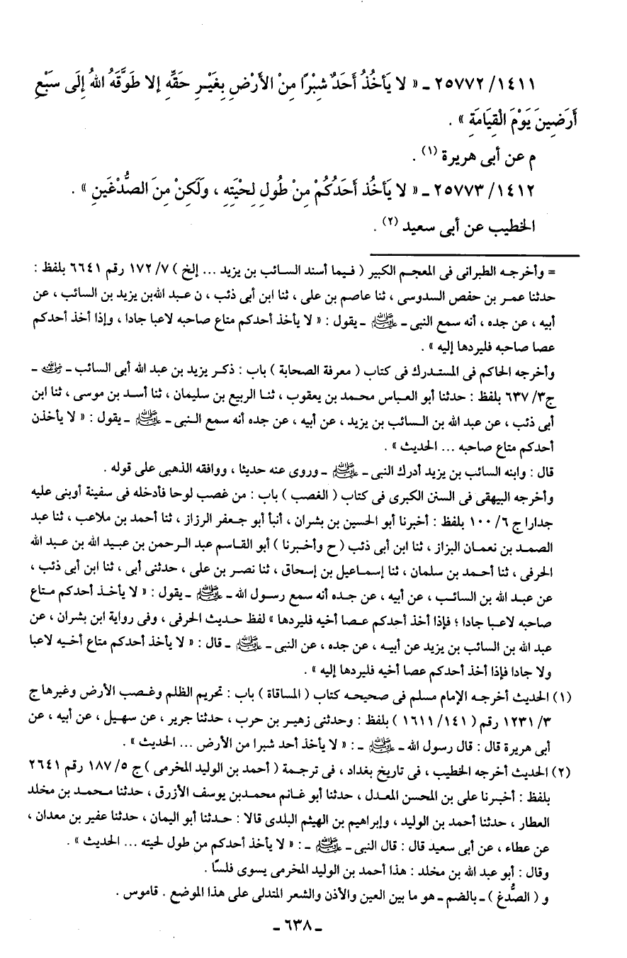 1411/ 25772 - "لا يَأخُذُ أَحَدٌ شِبْرًا مِنْ الأرْضِ بِغيرِ حَقِّهِ إلا طَوَّقَهُ اللهُ إِلَى سَبْعِ أَرَضِينَ يَوْمَ الْقِيَامَةِ".