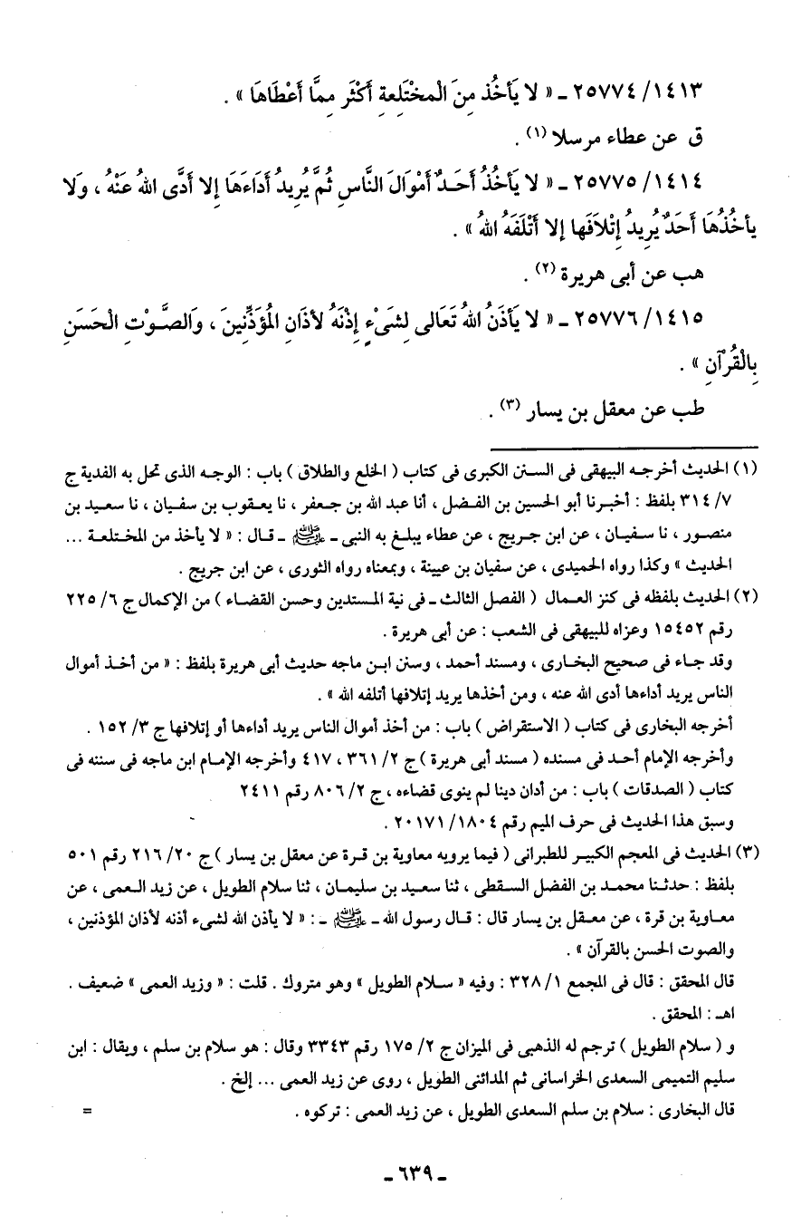 1415/ 25776 - "لا يَأذَنُ اللهُ تَعَالى لِشَىْءٍ إِذْنَهُ لأذَانِ المُؤَذِّنِينَ، وَالصَّوْتِ الْحَسَنِ بِالْقُرآنِ".