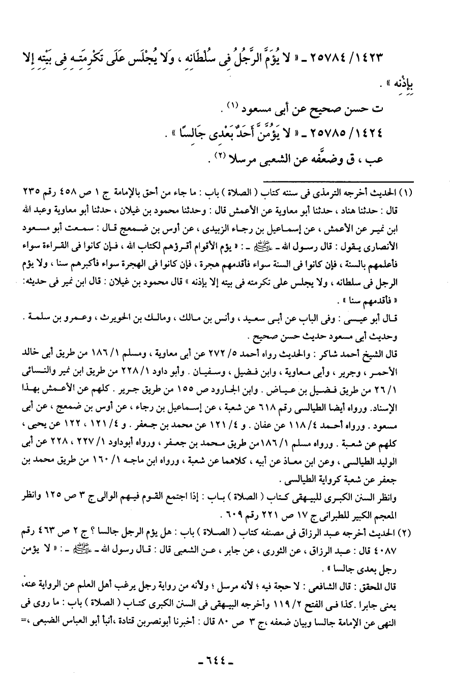 1423/ 25784 - "لا يُؤَمَ الرَّجُلُ في سُلْطَانِهِ، وَلا يُجْلَس عَلَى تَكْرِمَتِهِ فِي بَيتِهِ إِلا بِإِذْنِه".