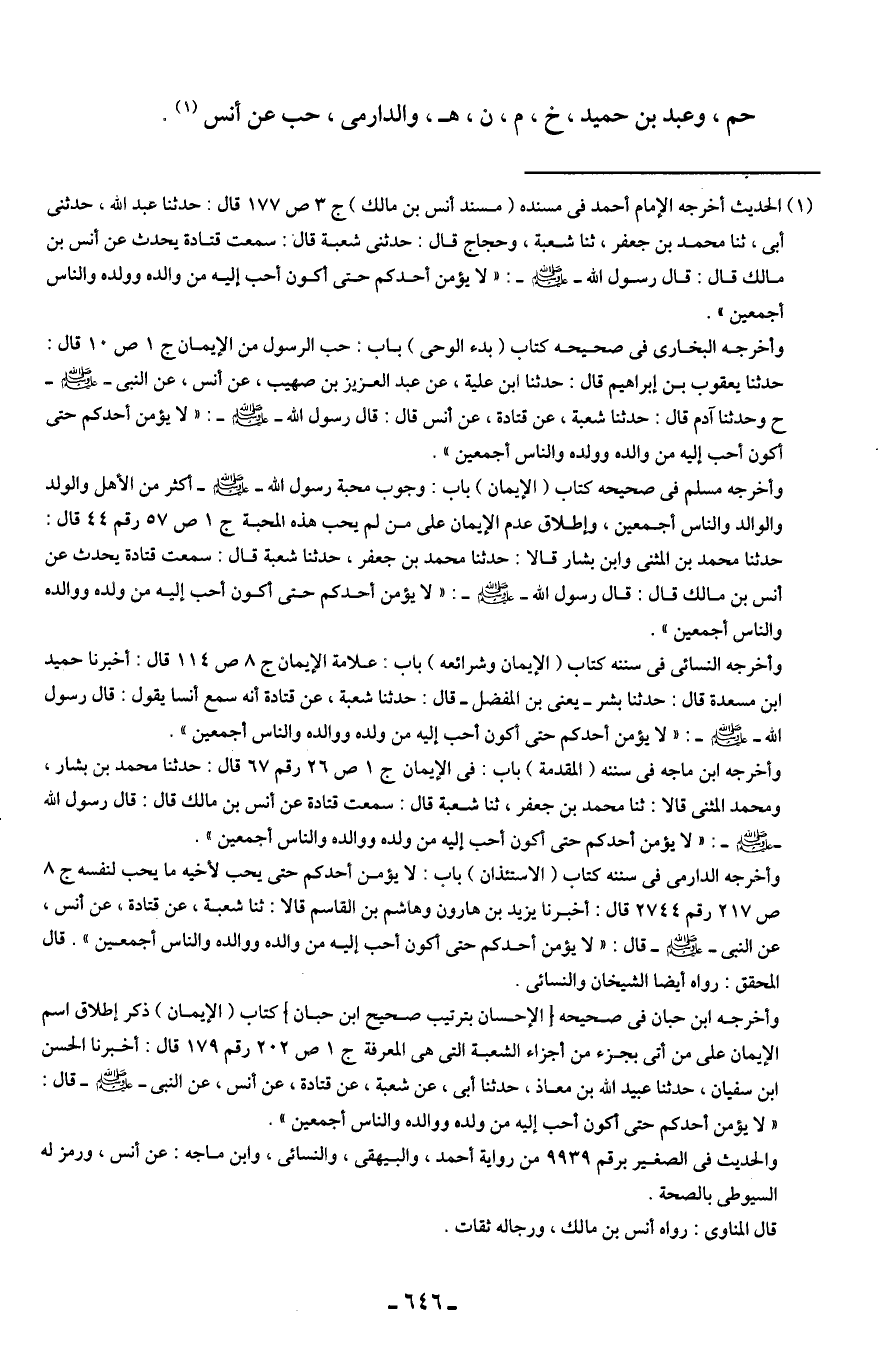 (¬1) الحديث أخرجه الإمام أحمد في مسنده (مسند أَنس بن مالك) ج 3 ص 177 قال: حدثنا عبد الله، حدثني أبي، ثنا محمد بن جعفر، ثنا شعبة، وحجاج قال: حدثني شعبة قال: سمعت قتادة يحدث عن أَنس بن مالك قال: قال رسول الله - صلى الله عليه وسلم -: "لا يؤمن أحدكم حتى أكون أحب إليه من والده وولده والناس أجمعين".