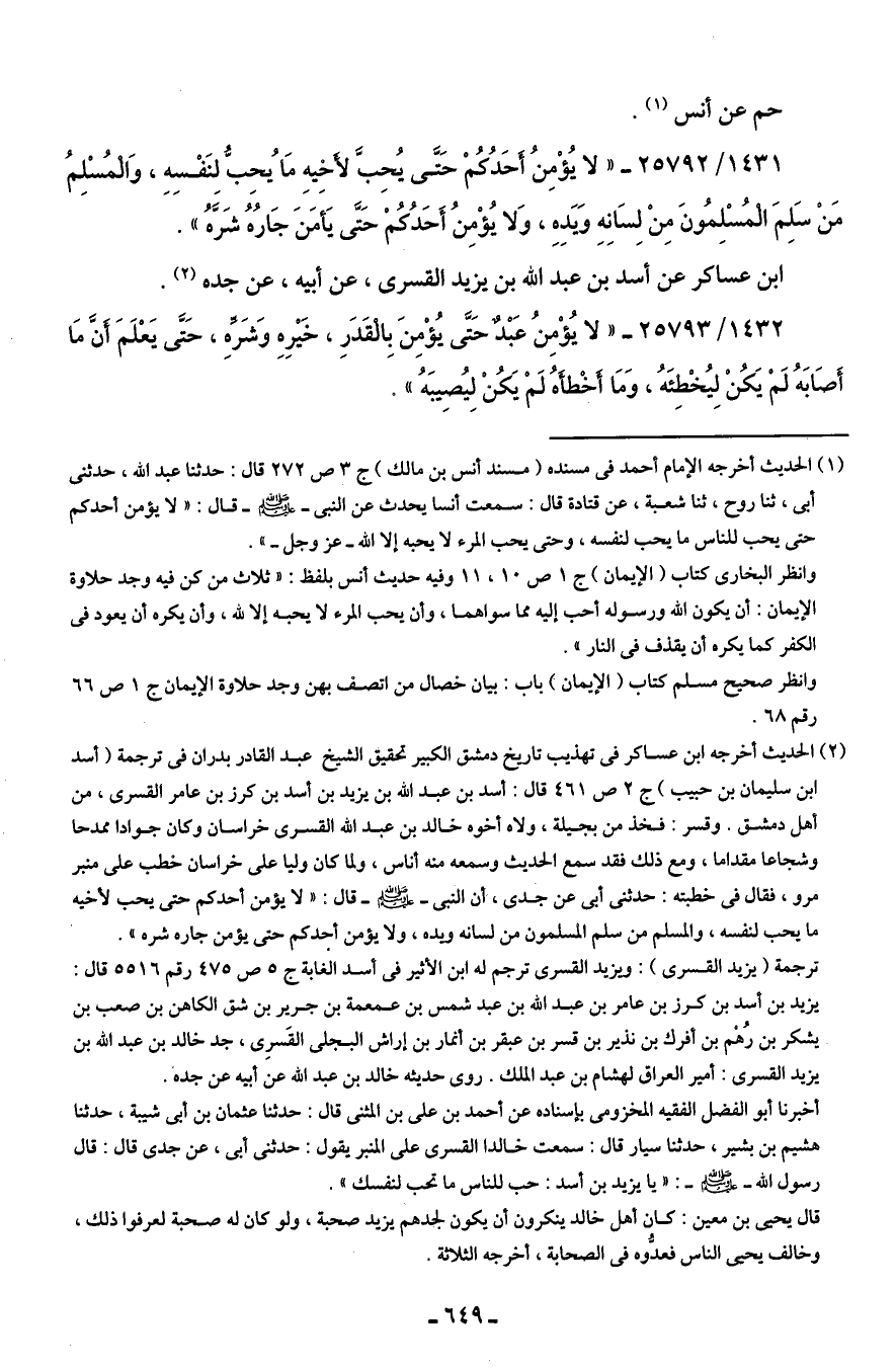 (¬2) الحديث أخرجه ابن عساكر في تهذيب تاريخ دمشق الكبير تحقيق الشيخ عبد القادر بدران في ترجمة (أسد بن سليمان بن حبيب) ج 2 ص 461 قال: أسد بن عبد الله بن يزيد بن أسد بن كرز بن عامر القسرى، من أهل دمشق. وقسر: فخذ من بجيلة، ولاه أخوه خالد بن عبد الله القسرى خراسان وكان جوادا ممدحا وشجاعا مقداما، ومع ذلك فقد سمع الحديث وسمعه منه أناس، ولما كان وليا على خراسان خطب على منبر مرو، فقال في خطبته: حدثني أبي عن جدى، أن النبي - صلى الله عليه وسلم - قال: "لا يؤمن أحدكم حتى يحب لاخيه ما يحب لنفسه، والمسلم من سلم المسلمون من لسانه ويده، ولا يؤمن أحدكم حتى يؤمن جاره شره".
