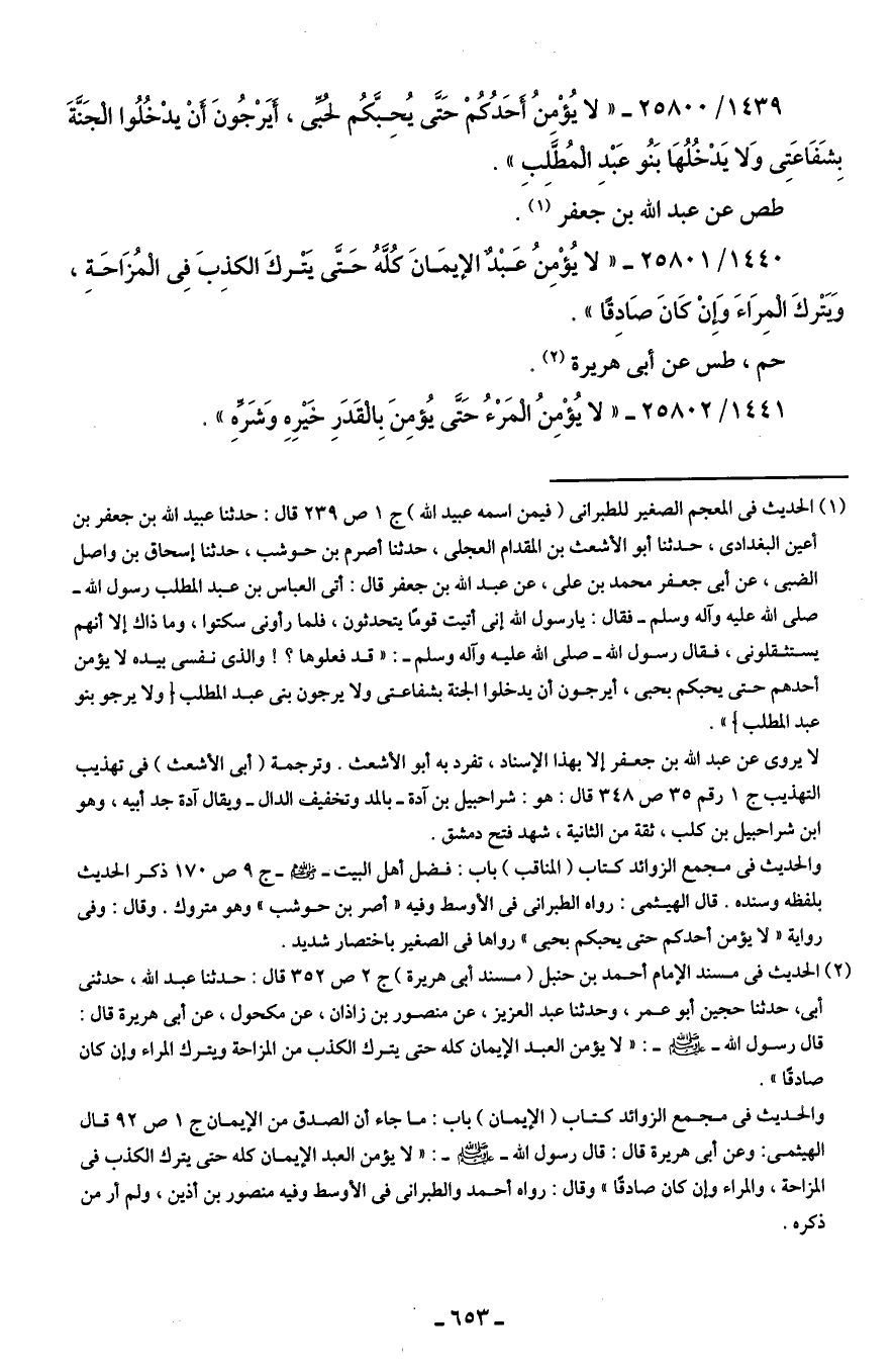 1439/ 25800 - "لا يُؤْمنُ أَحَدُكُمْ حَتَّى يُحِبُّكُم لُحبَّى، أَيَرْجُونَ أَنْ يدْخُلُوا الْجَنَّةَ بِشَفَاعَتِي وَلا يَدْخُلُهَا بَنُو عَبْدِ الْمُطلِبِ".