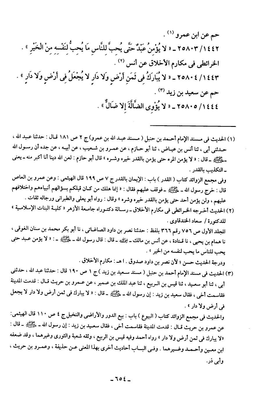 (¬3) الحديث في مسند الإمام أحمد بن حنبل (مسند سعيد بن زيد) ج 1 ص 190 قال: حدثنا عبد الله، حدثني أبي، ثنا أبو سعيد، ثنا قيس بن الربيع، ثنا عبد الملك بن عمير، عن عمرو بن حريث قال: قدمت المدينة فقاسمت أخي، فقال سعيد بن زيد: إن رسول الله - صلى الله عليه وسلم - قال: "لا يبارك في ثمن أرض ولا دار لا يجعل في أرض ولا دار".