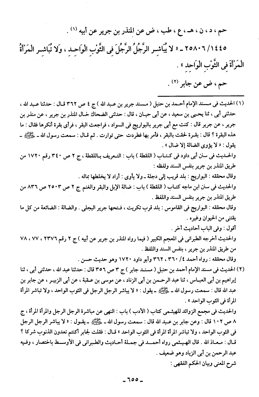 (¬2) الحديث في مسند الإمام أحمد بن حنبل (مسند جابر) ج 3 ص 356 قال: حدثنا عبد الله، حدثني أبي، ثنا إبراهيم بن أبي العباس، ثنا عبد الرحمن بن أبي الزناد، عن موسى بن عقبة، عن أبي الزبير، عن جابر بن عبد الله قال: سمعت رسول الله - صلى الله عليه وسلم - يقول: "لا يباشر الرجل الرجل في الثوب الواحد، ولا تباشر المرأة المرأة في الثوب الواحد".