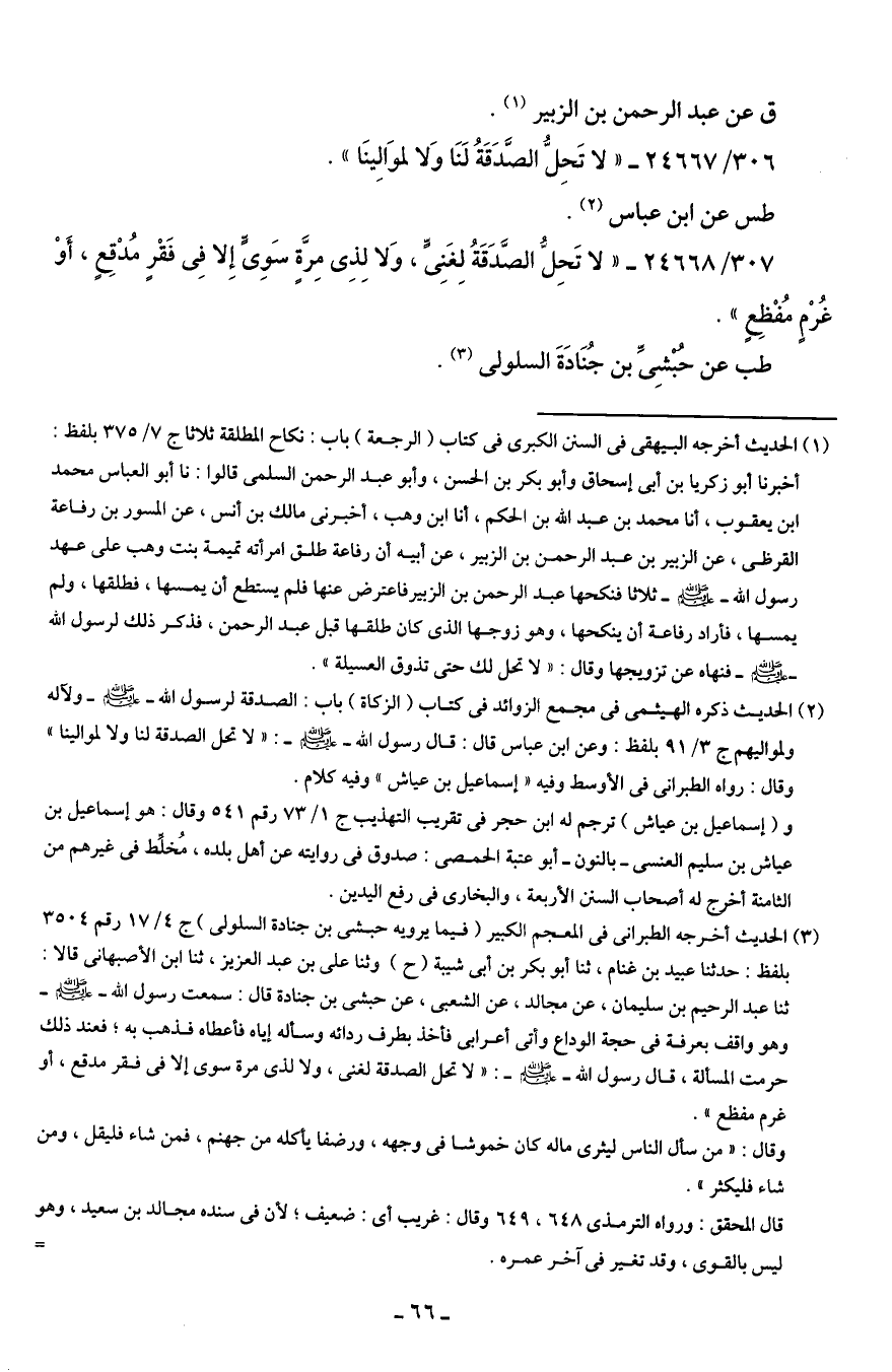 (¬2) الحديث ذكره الهيثمي في مجمع الزوائد في كتاب (الزكاة) باب: الصدقة لرسول الله - صلى الله عليه وسلم - ولآله ولمواليهم ج 3/ 91 بلفظ: وعن ابن عباس قال: قال رسول الله - صلى الله عليه وسلم -: "لا تحل الصدقة لنا ولا لموالينا" وقال: رواه الطبراني في الأوسط وفيه "إسماعيل بن عياش" وفيه كلام.