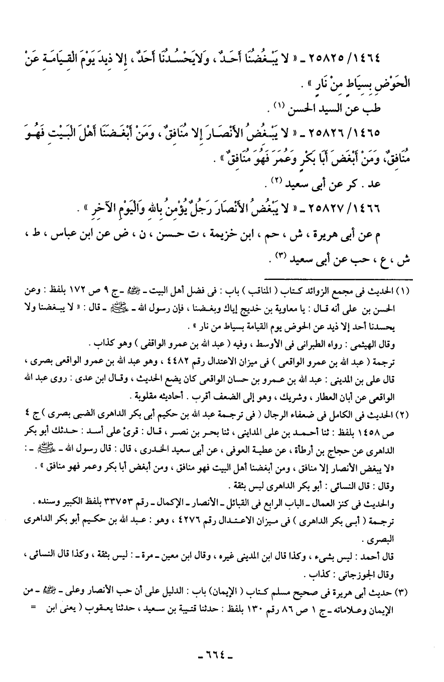 1465/ 25826 - "لا يَبْغُضُ الأَنْصَارَ إِلا مُنَافِقٍ، وَمَنْ أَبْغَضَنَا أَهْلَ الْبَيتِ فَهُوَ مُنَافِق ومَنْ أَبْغَضَ أَبَا بَكْرٍ وَعُمَرَ فَهُوَ مُنَافِقٌ".