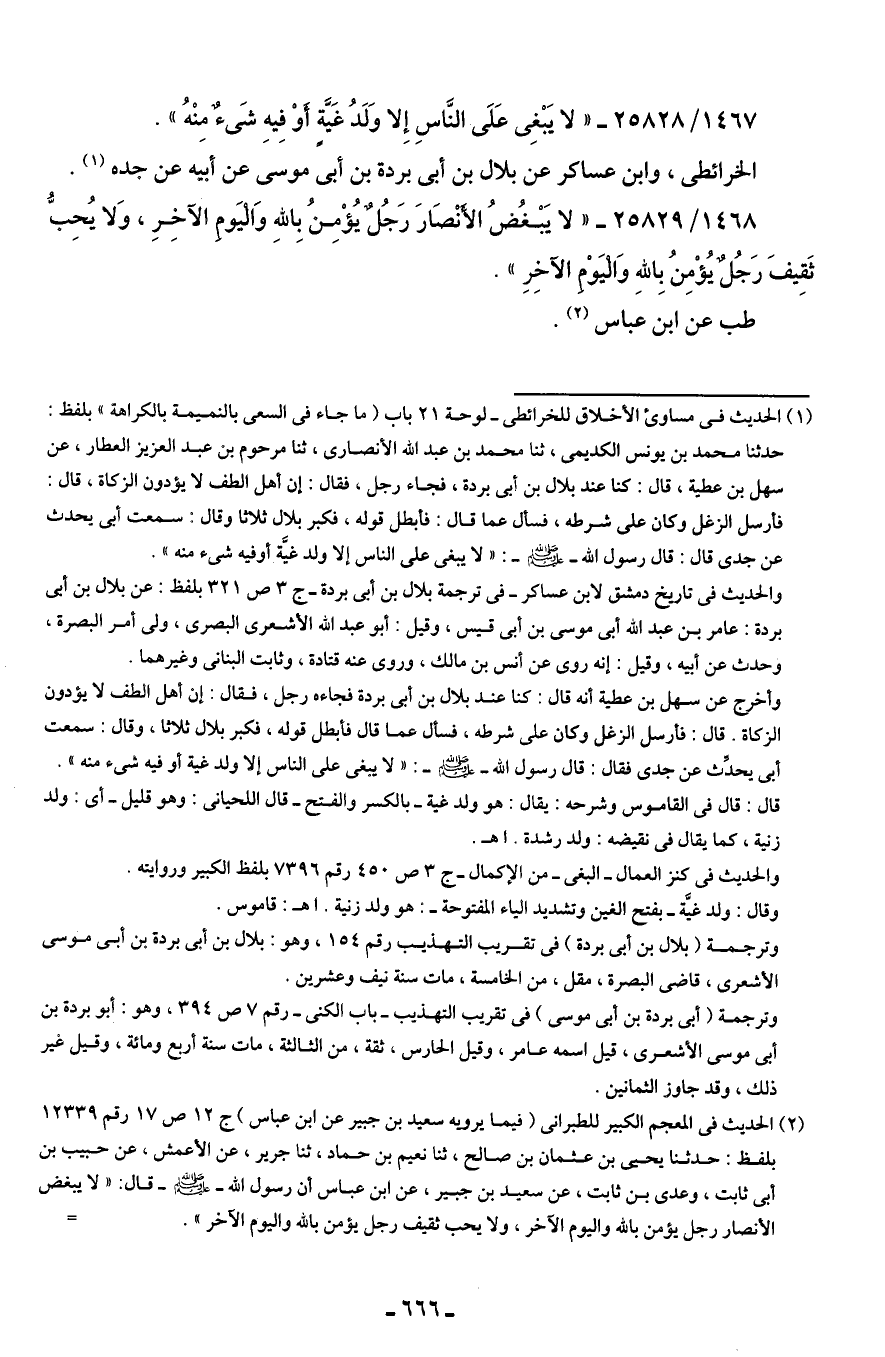 1468/ 25829 - "لا يَبْغُضُ الأنْصَارَ رَجُلٌ يُؤْمِن بِاللهِ وَالْيَوم الآخِرِ، وَلا يُحِبُّ ثَقِيفَ رَجُلٌ يُؤْمِنُ بِاللهِ وَالْيَوْمِ الآخِرِ".