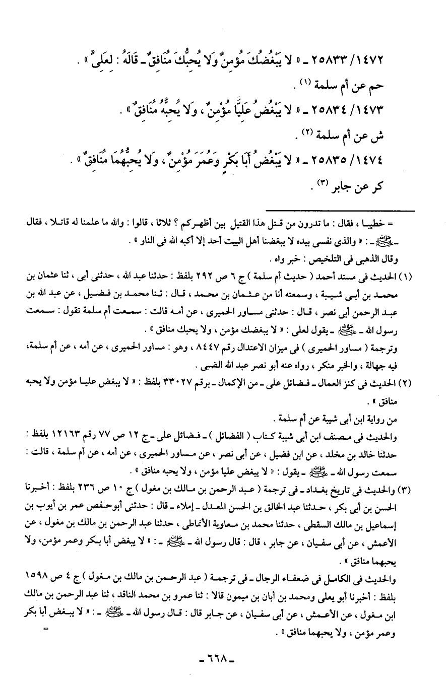 (¬1) الحديث في مسند أحمد (حديث أم سلمة) ج 6 ص 292 بلفظ: حدثنا عبد الله، حدثني أبي ثنا عثمان بن محمد بن أبي شيبة، وسمعته أنا من عثمان بن محمد، قال: ثنا محمد بن فضيل، عن عبد الله بن عبد الرحمن أبي نصر، قال: حدثني مساور الحميري، عن أمه قالت: سمعت أم سلمة تقول: سمعت رسول الله - صلى الله عليه وسلم - يقول لعلي: "لا يبغضك مؤمن، ولا يحبك منافق".