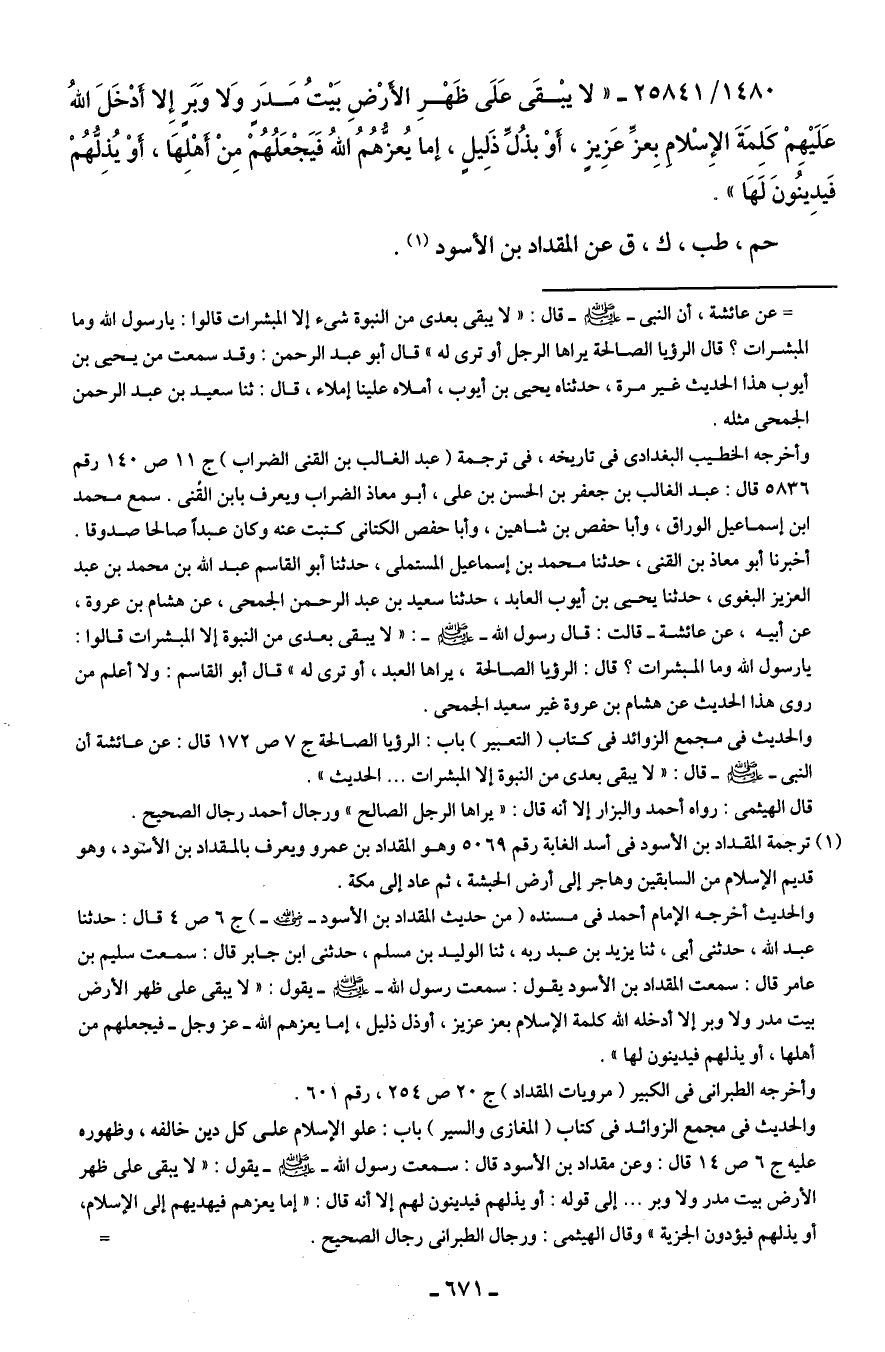 1480/ 25841 - "لا يبْقَى عَلَى ظَهْرِ الأرْضِ بَيتُ مَدَرٍ وَلا وَبَرٍ إِلا أَدْخَلَ اللهُ عَلَيهِمْ كلِمَةَ الإِسْلامِ بِعزِّ عَزِيزٍ، أوْ بذُلِّ ذَليلٍ، إما يُعزُّهُمُ اللهُ فَيَجْعَلُهُمْ منْ أَهْلهَا، أوْ يُذلُّهُمْ فَيدِينُونَ لَهَا".