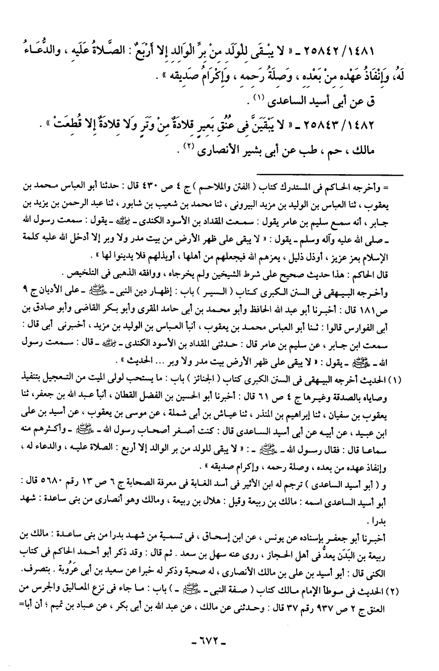 1481/ 25842 - "لا يبْقَى لِلوَلَدِ مِنْ بِرِّ الْوَالِدِ إِلا أرْبَعٌ: الصَّلاةُ عَلَيهِ، والدُّعَاءُ لَهُ، وَإِنْفَاذُ عَهْدهِ مِنْ بَعْدِهِ، وَصِلَةُ رَحِمهِ، وَإكْرَامُ صَدِيقه".