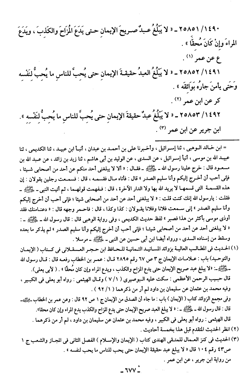 (¬3) الحديث في كنز العمال للمتقي الهندي كتاب (الإيمان والإسلام) الفصل الثاني في المجاز والشعب ج 1 ص 43 رقم 104 قال "لا يبلغ عبد حقيقة الإيمان حتى يحب للناس ما يحب لنفسه".