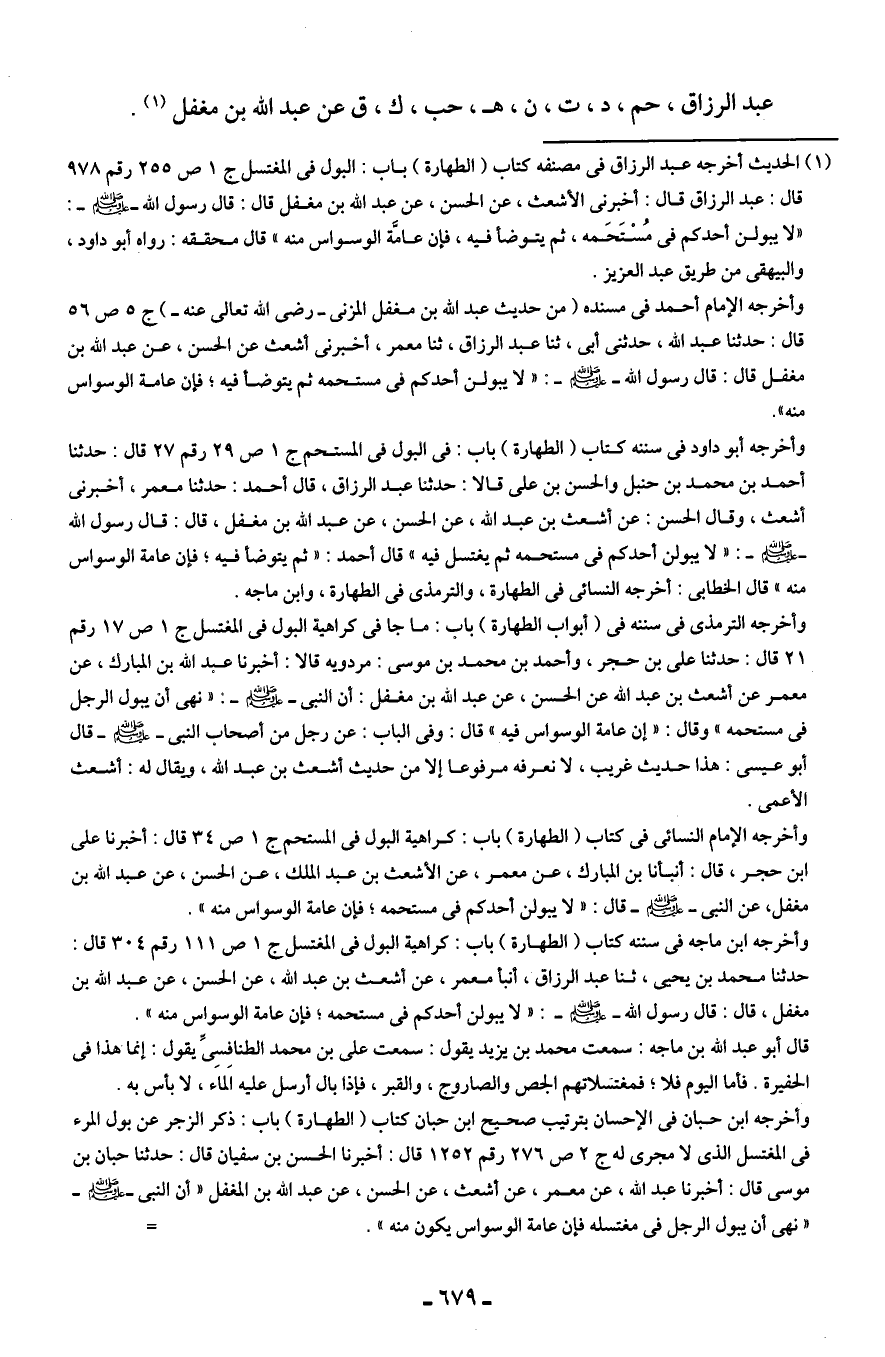 (¬1) الحديث أخرجه عبد الرزاق في مصنفه كتاب (الطهارة) باب: البول في المغتسل ج 1 ص 255 رقم 978 قال: عبد الرزاق قال: أخبرني الأشعث، عن الحسن، عن عبد الله بن مغفل قال: قال رسول الله - صلى الله عليه وسلم -: "لا يبولن أحدكم في مُسْتَحَمه، ثم يتوضأ فيه، فإن عامّة الوسواس منه" قال محققه: رواه أبو داود، والبيهقي من طريق عبد العزيز.