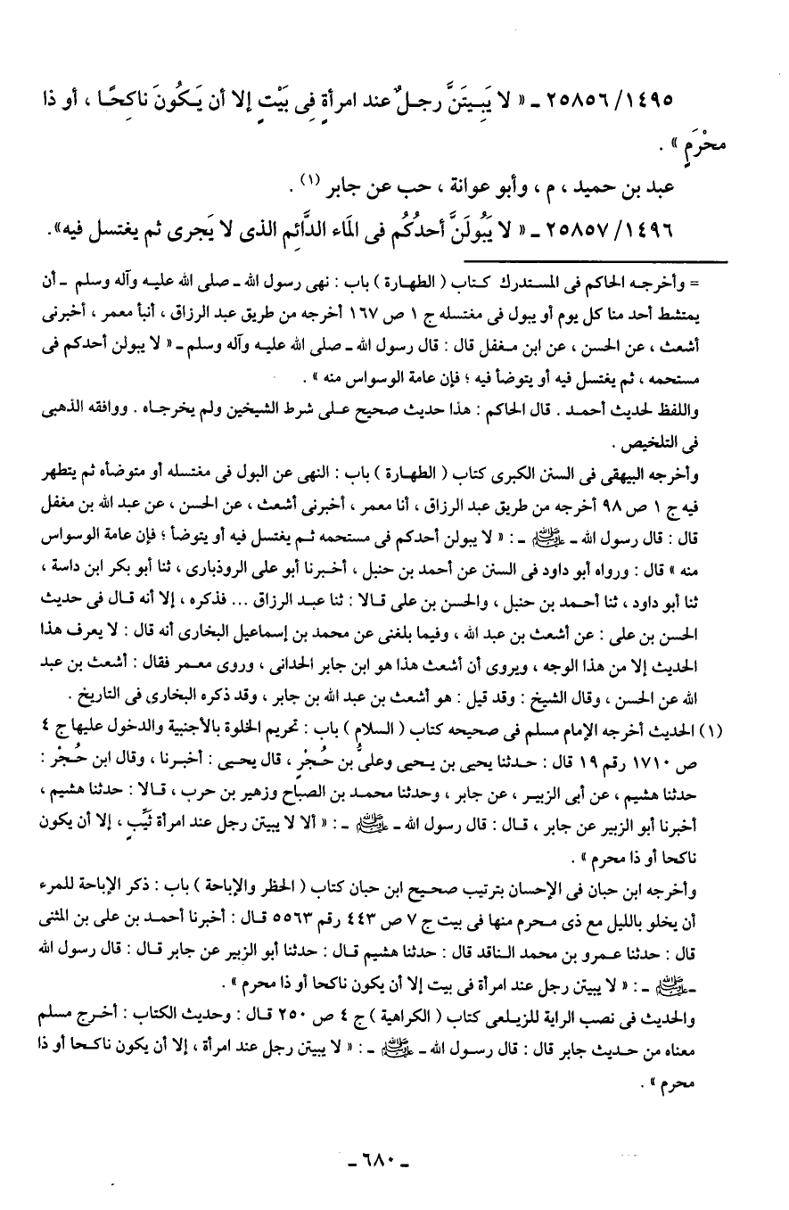 وأخرجه ابن حبان في الإحسان بترتيب صحيح ابن حبان كتاب (الحظر والإباحة) باب: ذكر الإباحة للمرء أن يخلو بالليل مع ذي محرم منها في بيت ج 7 ص 443 رقم 5563 قال: أخبرنا أحمد بن علي بن المثنى قال: حدثنا عمرو بن محمد الناقد قال: حدثنا هشيم قال: حدثنا أبو الزبير عن جابر قال: قال رسول الله - صلى الله عليه وسلم -: "لا يبيتن رجل عند امرأة في بيت إلا أن يكون ناكحا أو ذا محرم".