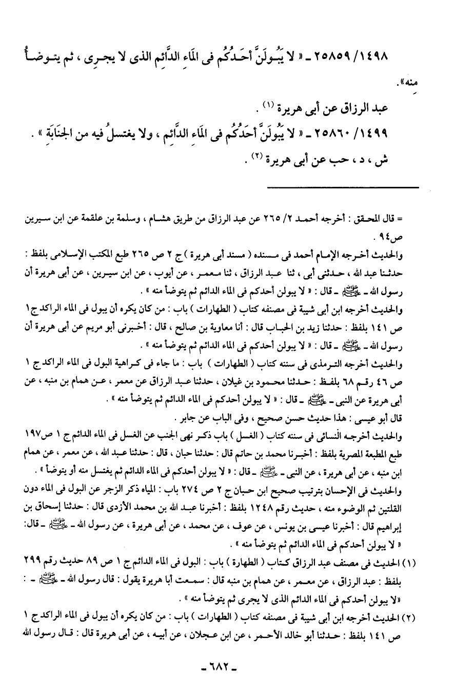 (¬1) الحديث في مصنف عبد الرزاق كتاب (الطهارة) باب: البول في الماء الدائم ج 1 ص 89 حديث رقم 299 بلفظ: عبد الرزاق، عن معمر، عن همام بن منبه قال: سمعت أبا هريرة يقول: قال رسول الله - صلى الله عليه وسلم -: "لا يبولن أحدكم في الماء الدائم الذي لا يجرى ثم يتوضأ منه".
