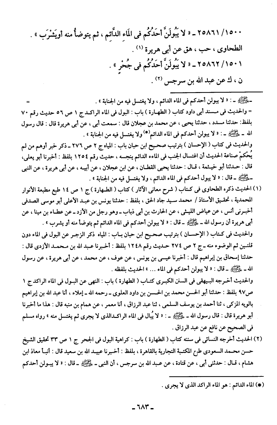 1500/ 25861 - "لا يَبُولَنَّ أحَدُكُم في المَاءِ الدَّائِم، ثم يتوضأُ منه أو يَشْرَب".