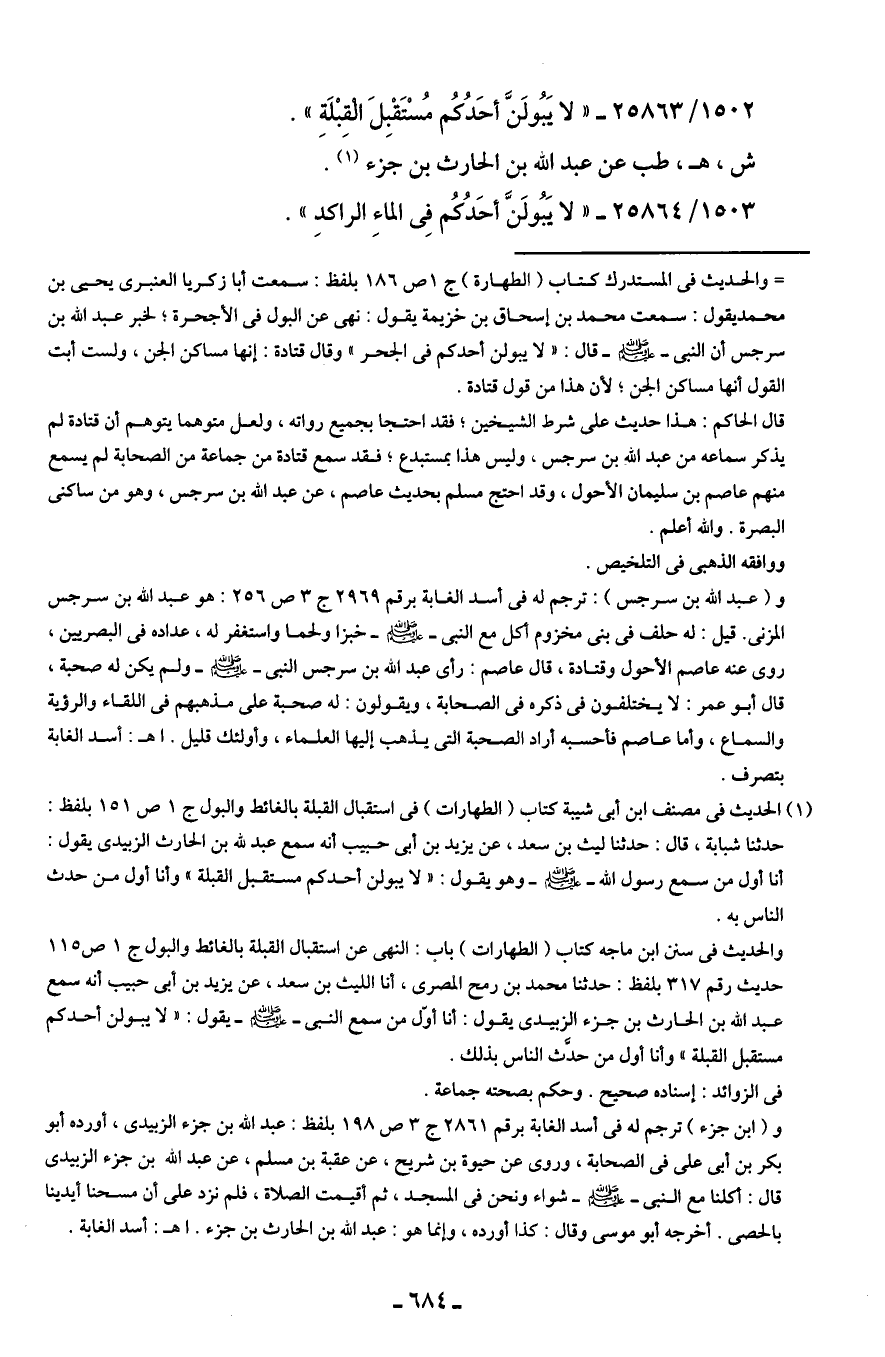 1502/ 25863 - "لا يَبُولَنَّ أَحَدُكُم مُسْتَقْبِلَ الْقِبْلَةِ".