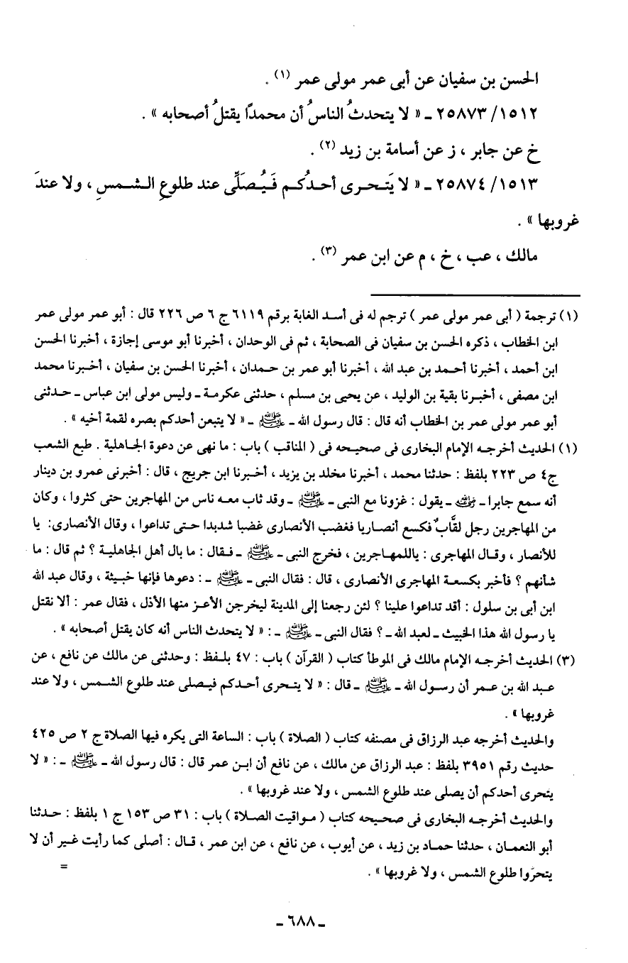 (¬3) الحديث أخرجه الإمام مالك في الموطأ كتاب (القرآن) باب: 47 بلفظ: وحدثني عن مالك عن نافع، عن عبد الله بن عمر أن رسول الله - صلى الله عليه وسلم - قال: "لا ينحر أحدكم فيصلى عند طلوع الشمس، ولا عند غروبها".