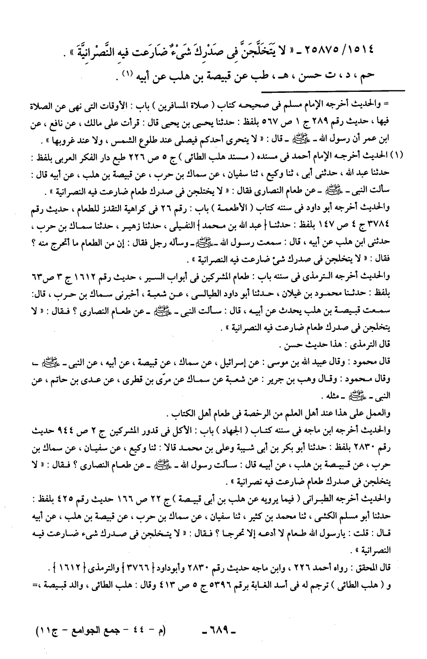 (¬1) الحديث أخرجه الإمام أحمد في مسنده (مسند هلب الطائى) ج 5 ص 226 طبع دار الفكر العربي بلفظ: حدثنا عبد الله، حدثني أبي، ثنا وكيع، ثنا سفيان، عن سماك بن حرب، عن قبيصة بن هلب، عن أبيه قال: سألت النبي - صلى الله عليه وسلم - عن طعام النصارى فقال: "لا يختلجن في صدرك طعام ضارعت فيه النصرانية".