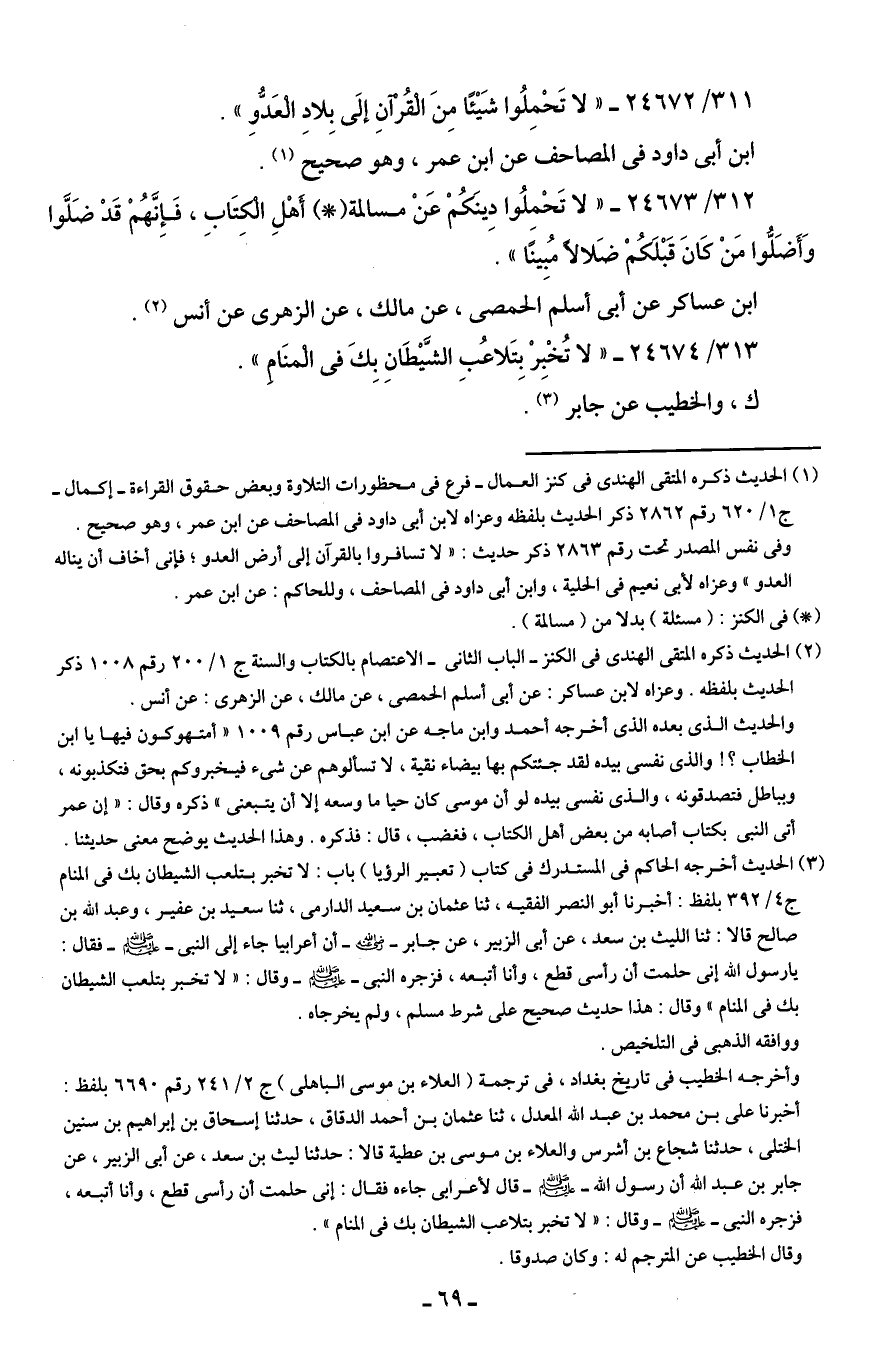 311/ 24672 - "لا تَحْمِلُوا شَيئًا مِنَ الْقُرْآنِ إلَى بِلادِ الْعَدُّو".
