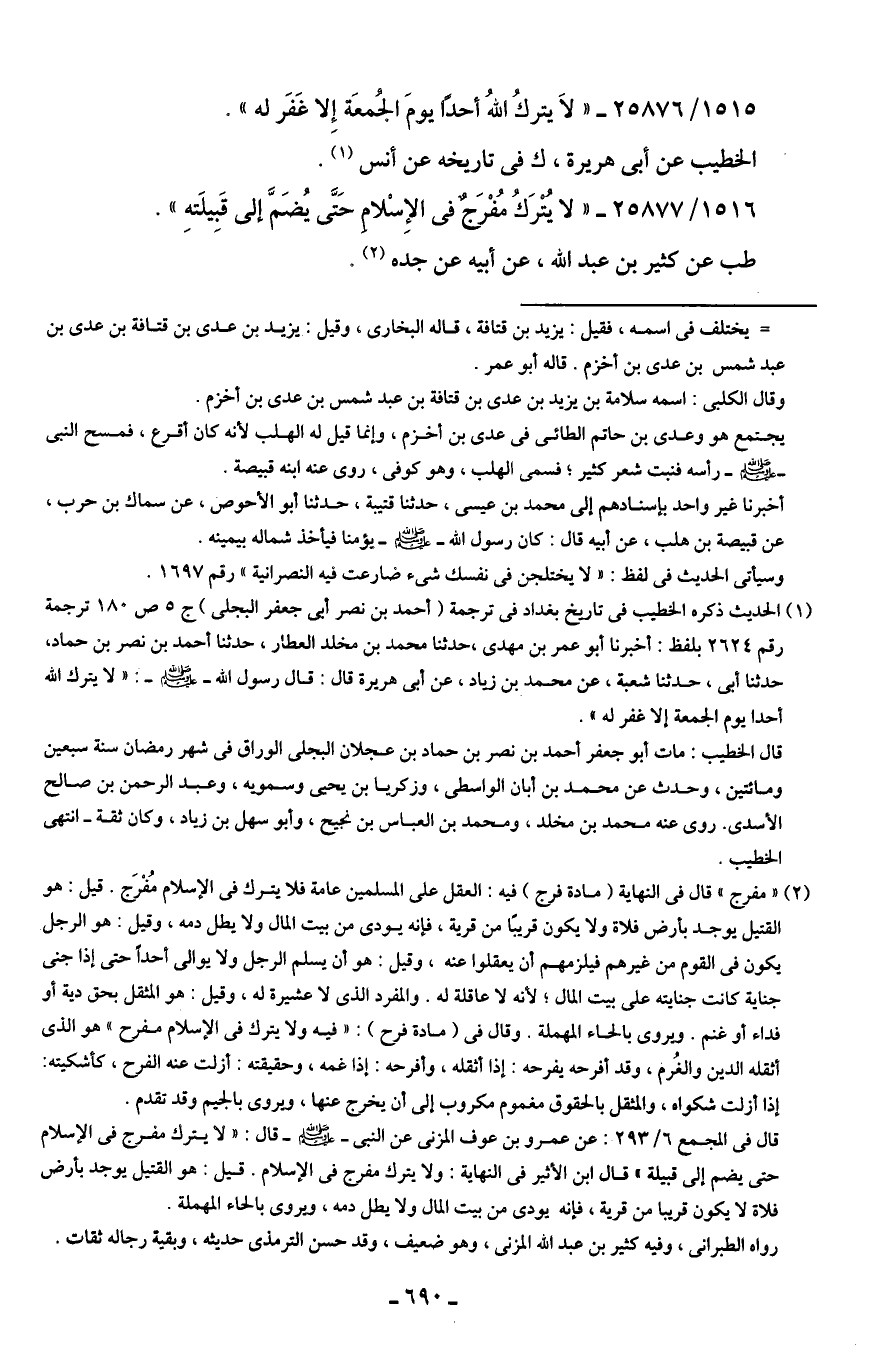1516/ 25877 - "لا يُتْرَكُ مُفْرَجٌ في الإِسْلامِ حَتَّى يُضَمَّ إلى قَبِيلَتهِ".