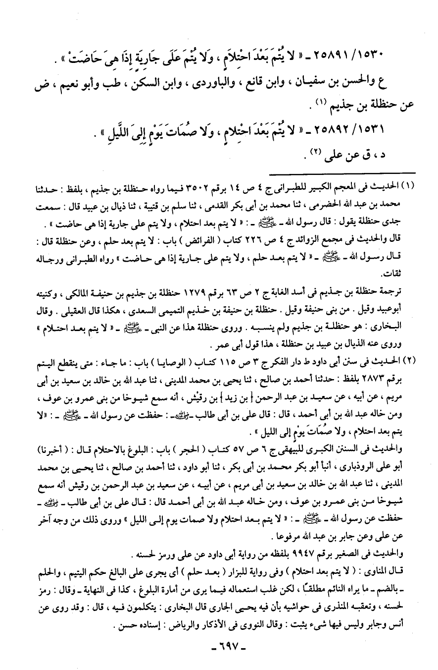1530/ 25891 - "لا يُتْمَ بَعْدَ احْتِلَامٍ، وَلا يُتْمَ عَلَى جَارِيَةٍ إِذَا هِيَ حَاضَتْ".