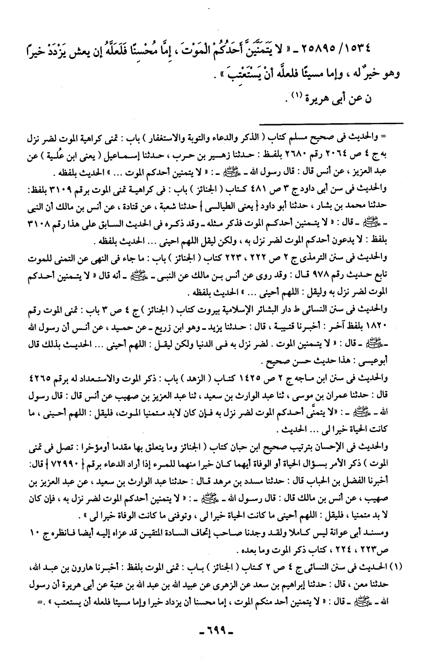 1534/ 25895 - "لا يَتَمَنَّيَنَّ أحَدُكُمْ الْمَوْتَ، إِمَّا مُحْسِنًا فَلَعَلَّهُ إن يعش يَزْدَدْ خيرًا وهو خير له، وإما مسيئًا فلعلَّه أنْ يَسْتَعْتِبَ".