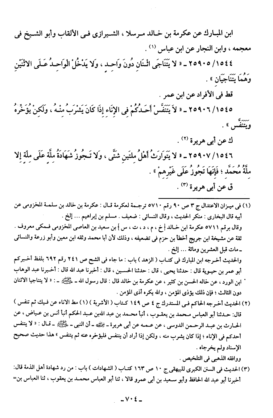 (¬1) في ميزان الاعتدال ج 3 ص 90 رقم 5710 ترجمة لعكرمة قال: عكرمة بن خالد بن سلمة المخزومي عن أبيه قال البخاري: منكر الحديث، وقال النسائي: ضعيف. مسلم بن إبراهيم ... إلخ.