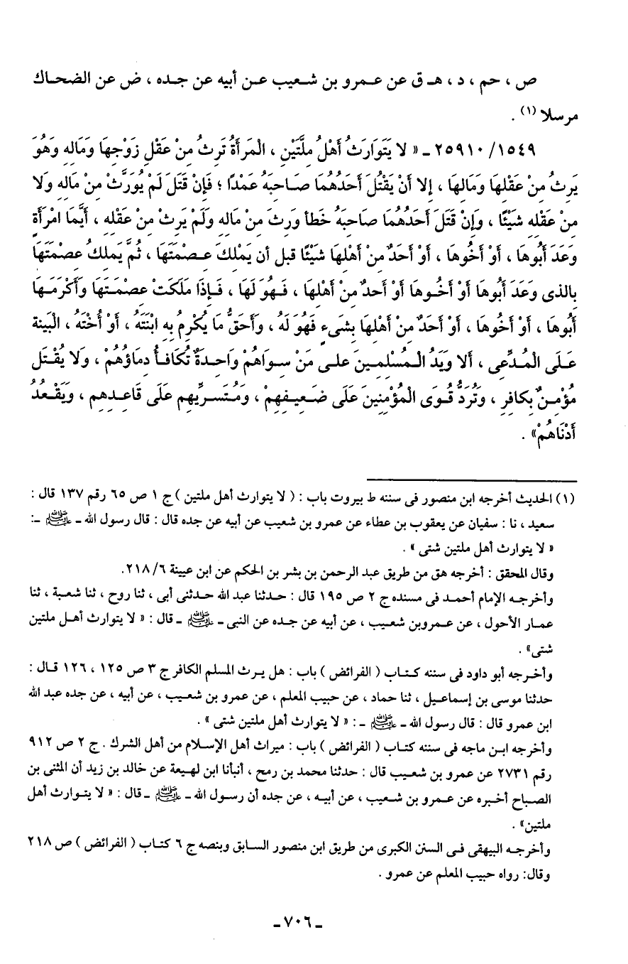 1549/ 25910 - "لا يَتَوَارَثُ أهْلُ مِلَّتَينِ، الْمَرأةُ تَرِثُ مِنْ عَقْلِ زَوْجِهَا وَمَالِهِ وَهُوَ يَرِثُ مِنْ عَقْلِهَا وَمَالِهَا، إِلا أنْ يَقْتُلَ أَحَدُهُمَا صَاحِبَهُ عَمْدًا؛ فَإنْ قَتَلَ لَمْ يُوَرَّث مِنْ مَالِهِ وَلا مِنْ عَقْلِهِ شَيئًا، وَإنْ قَتَلَ أحَدُهُمَا صَاحِبَهُ خَطأ وَرِثَ مِنْ مَالِهِ وَلَمْ يَرِثْ مِنْ عَقْلِهِ، أيَّمَا امْرَأةٍ وَعَدَ أبُوهَا، أوْ أخُوهَا، أوْ أَحَدٌ مِنْ أهْلِهَا شَيئًا قبل أن يَمْلِكَ عِصْمَتَهَا، ثُمَّ يَملِكُ عصْمَتَهَا بالذي وَعَدَ أَبُوهَا أوْ أخُوهَا أوْ أَحدٌ مِنْ أهْلِهَا، فَهُوَ لَهَا، فَإِذَا مَلَكَتْ عِصْمَتَهَا وَأَكْرَمَهَا أَبُوهَا، أوْ أخُوهَا، أوْ أحَدٌ مِنْ أهْلِهَا بشَيءٍ فَهُوَ لَهُ، وَأحَقُّ مَا يُكْرِمُ بِهِ ابْنَتَهُ , أوْ أخْتَهُ، الْبَينة عَلَى المُدِّعِي، ألا وَيَدُ المُسْلمِينَ على مَنْ سِوَاهُمْ وَاحِدَةٌ تُكَافأ دِمَاؤُهُمْ، وَلا يُقْتَل مُؤْمِنٌ بِكافِرِ، وَتُرَدُّ قُوَى الْمُؤْمَنِينَ عَلَى ضَعِيفِهِمْ، وَمُتَسرِّيهِم عَلَى قَاعِدِهِم، وَيَقْعُدُ أدْنَاهُمْ".