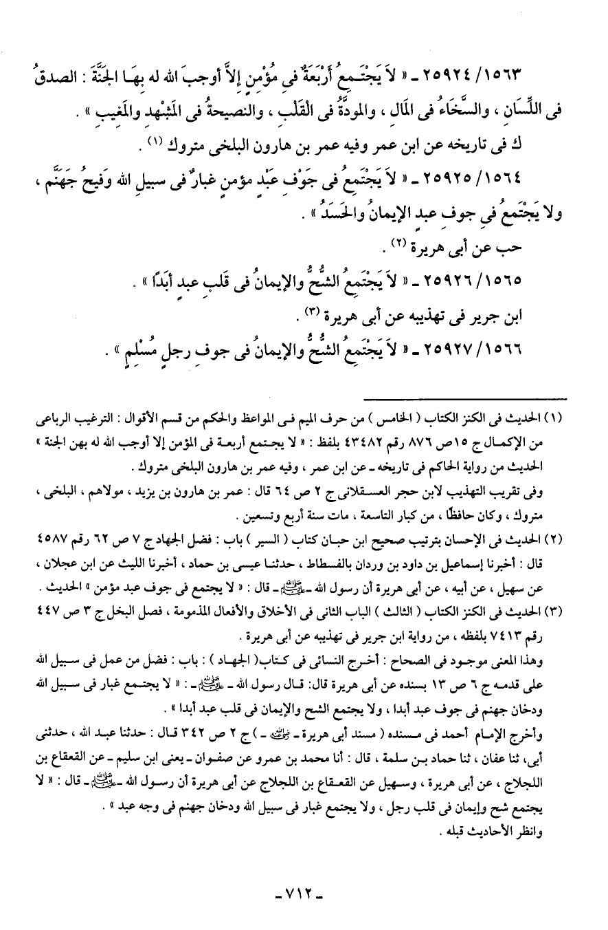 (¬2) الحديث في الإحسان بترتيب صحيح ابن حبان كتاب (السير) باب: فضل الجهاد ج 7 ص 62 رقم 4587 قال: أخبرنا إسماعيل بن داود بن وردان بالفسطاط، حدثنا عيسى بن حماد، أخبرنا الليث عن ابن عجلان، عن سهيل، عن أبيه، عن أبي هريرة أن رسول الله - صلى الله عليه وسلم - قال: "لا يجتمع في جوف عبد مؤمن" الحديث.