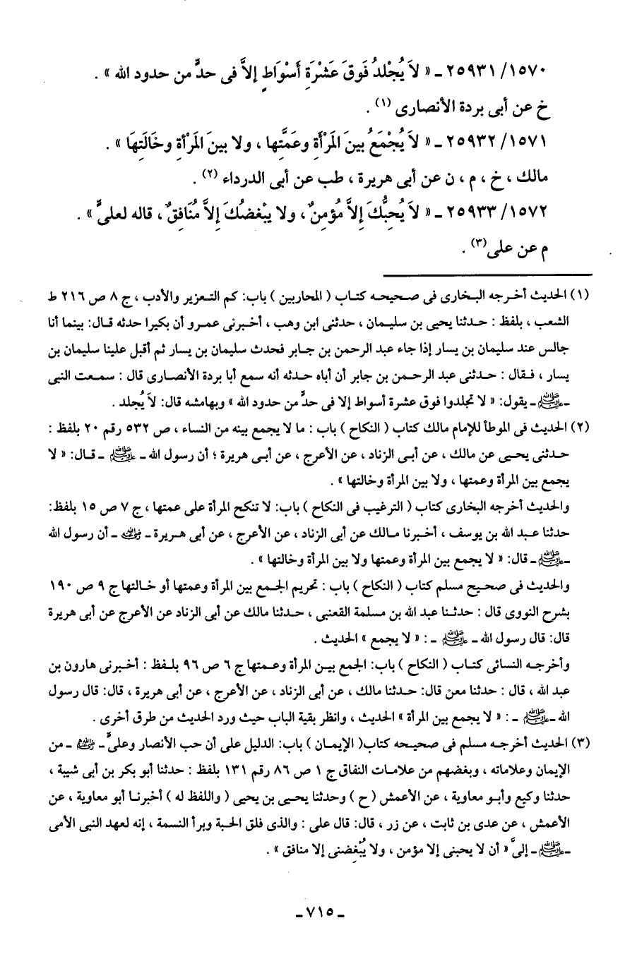 (¬1) الحديث أخرجه البخاري في صحيحه كتاب (المحاربين) باب: كم التعزير والأدب، ج 8 ص 216 ط الشعب، بلفظ: حدثنا يحيى بن سليمان، حدثني ابن وهب، أخبرني عمرو أن بكيرا حدثه قال: بينما أنا جالس عند سليمان بن يسار إذا جاء عبد الرحمن بن جابر فحدث سليمان بن يسار ثم أقبل علينا سليمان بن يسار، فقال: حدثني عبد الرحمن بن جابر أن أباه حدثه أنه سمع أبا بردة الأنصاري قال: سمعت النبي - صلى الله عليه وسلم - يقول: "لا تجلدوا فوق عشرة أسواط إلا في حدٍّ من حدود الله" وبهامشه قال: لَا يُجلد.