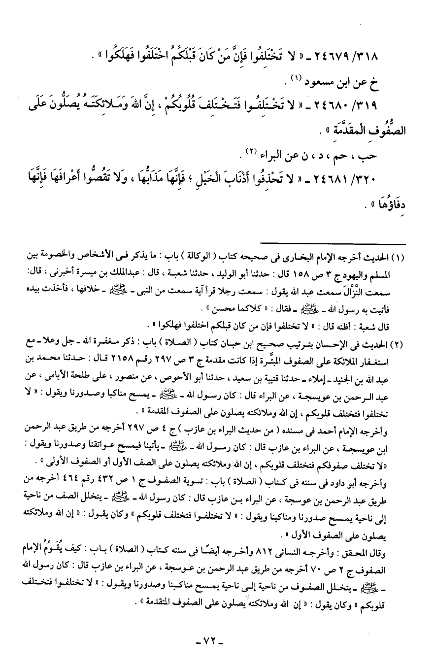 319/ 24680 - "لا تَخْتَلِفُوا فَتَخْتَلِفَ قُلُوبُكُمْ، إِنَّ اللهَ وَمَلائكَتَهُ يُصَلُّونَ عَلَى الصُّفُوفِ الْمقَدَّمَةِ".