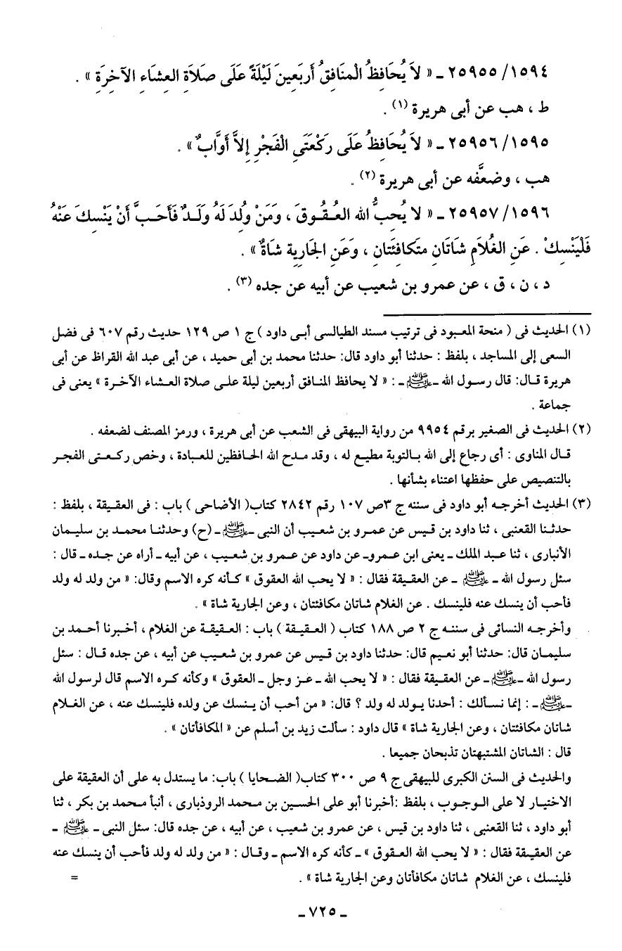 1596/ 25957 - "لا يحِبُّ الله العُقُوقَ، وَمَنْ ولُدَ لَهُ وَلَدٌ فَأَحَبَّ أنْ يَنْسِكَ عَنْهُ فَليَنْسِكْ. عَنِ الغُلامِ شَاتَانِ متَكافِئَتانِ، وَعَنِ الجَارِيِة شَاةٌ".