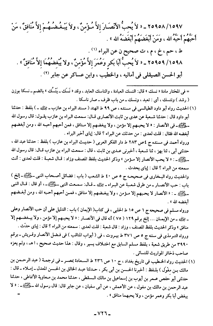 1597/ 25958 - "لَا يُحِبُّ الأنْصَارَ إِلَّا مُؤْمِنٌ، ولا يَبْغُضُهُمْ إِلَّا مُنَافِقٌ، مَنْ أحَبَّهُمْ أحَبَّهُ الله، وَمَنْ أَبْغَضَهُمْ أبْغَضَهُ الله".
