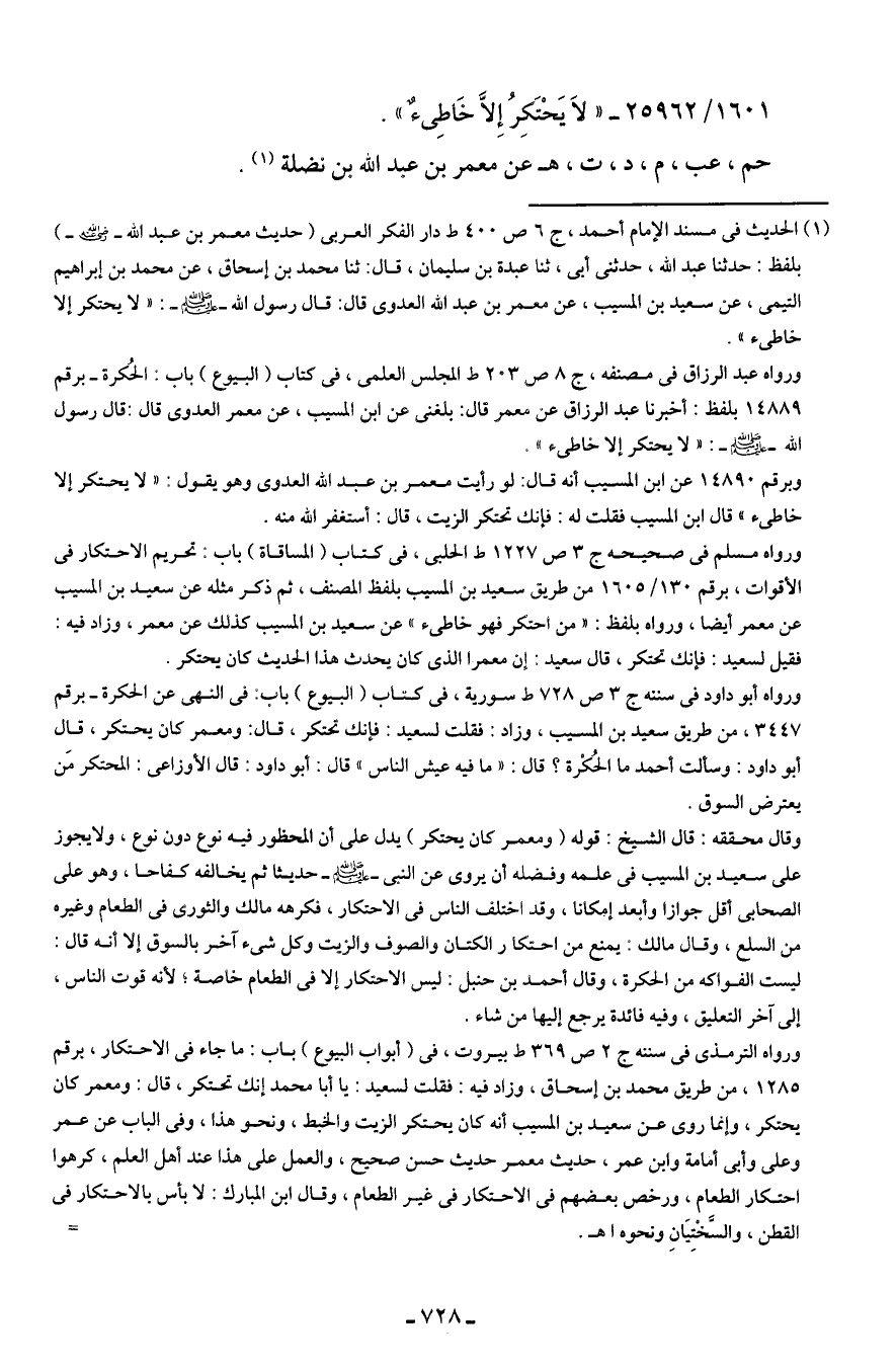 (¬1) الحديث في مسند الإمام أحمد، ج 6 ص 400 ط دار الفكر العربي (حديث معمر بن عبد الله - رضي الله عنه -) بلفظ: حدثنا عبد الله، حدثني أبي، ثنا عبدة بن سليمان، قال: ثنا محمد بن إسحاق، عن محمد بن إبراهيم التيمي، عن سعيد بن المسيب، عن معمر بن عبد الله العدوي قال: قال رسول الله - صلى الله عليه وسلم -: "لا يحتكر إلا خاطئ".