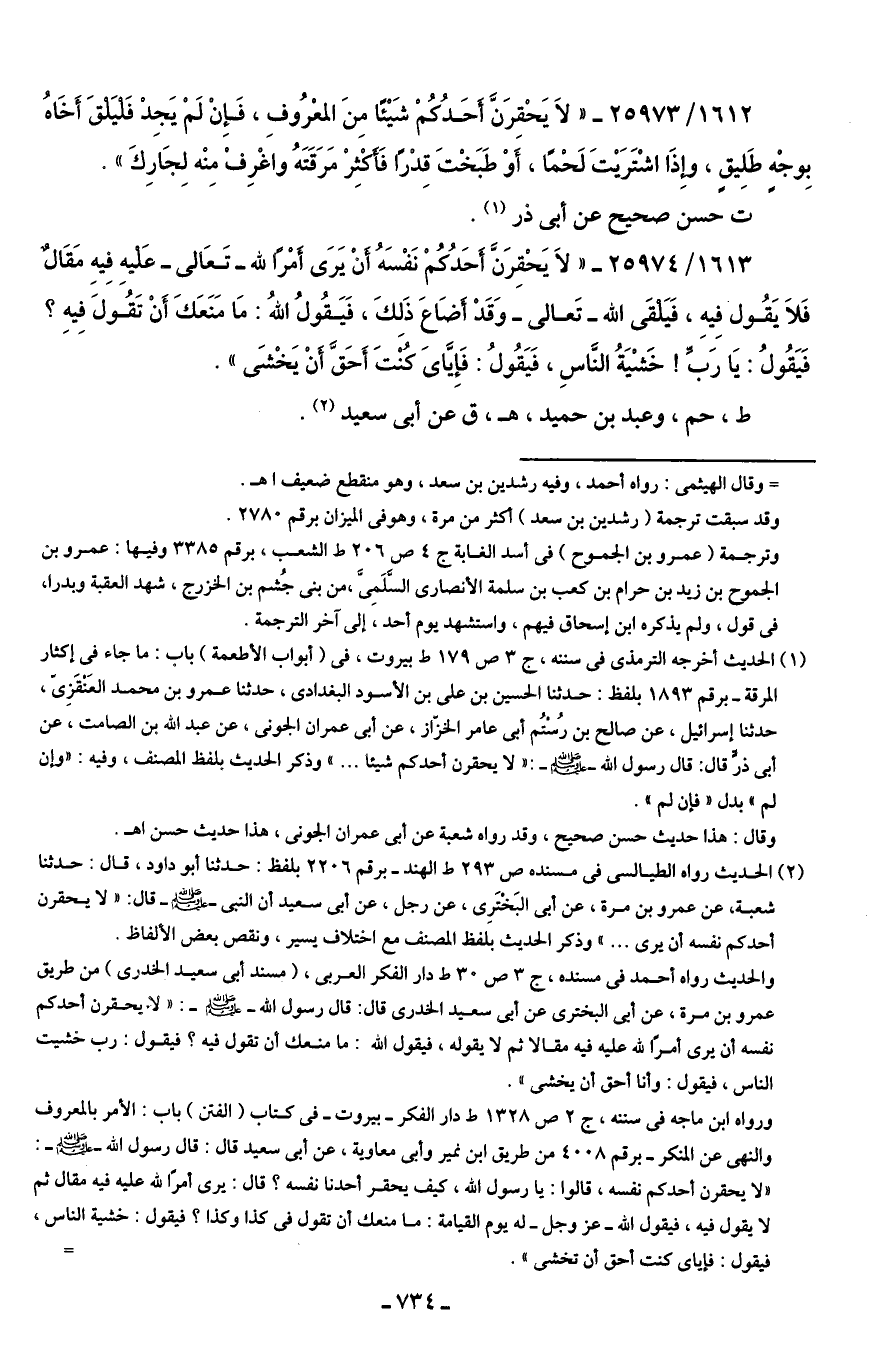 1613/ 25974 - "لَا يَحْقِرَنَّ أَحَدُكُمْ نَفْسَهُ أَنْ يَرَى أَمْرًا لله -تَعَالى- عَلْيهِ فِيهِ مَقَالٌ فَلَا يَقُول فِيهِ، فَيَلْقَى الله -تَعالى- وَقَدْ أَضَاعَ ذَلِكَ، فَيَقُولُ اللهُ: مَا مَنَعَكَ أَنْ تَقُولَ فِيهِ؟ فَيَقُولُ: يَا رَبِّ! خَشْيَةُ النَّاسِ، فَيَقُولُ: فَإِيَّاى كُنْتَ أَحَقَّ أَنْ يَخْشَى".