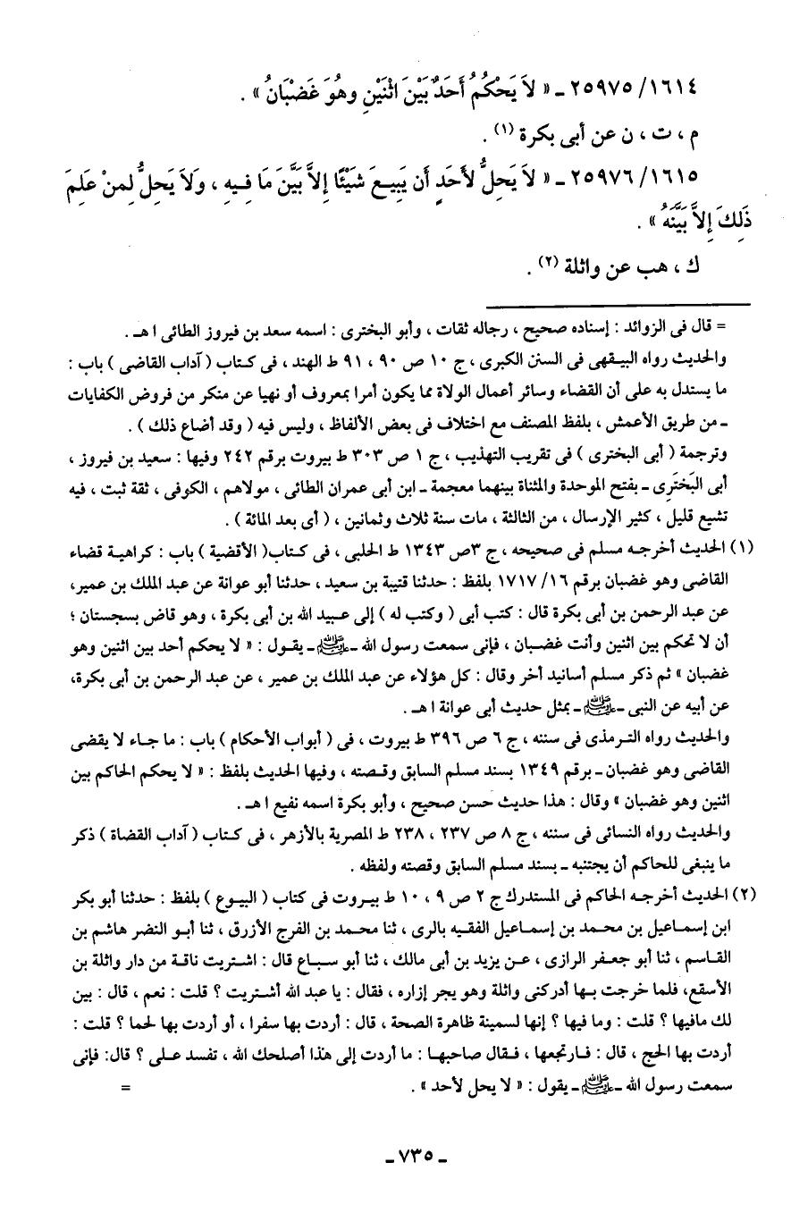 1614/ 25975 - "لَا يَحْكُمُ أَحَدٌ بَينَ اثْنَينِ وهُوَ غَضْبَانُ".
