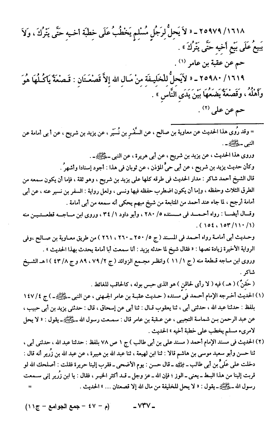 1618/ 25979 - "لَا يَحِلُّ لِرَجُلٍ مُسْلِمٍ يَخْطُبُ عَلَى خِطْبَة أخيهِ حَتَّى يَتْرُكَ، وَلَا يَبيعُ عَلَى بَيعِ أَخِيهِ حَتَّى يَتْرُكَ".